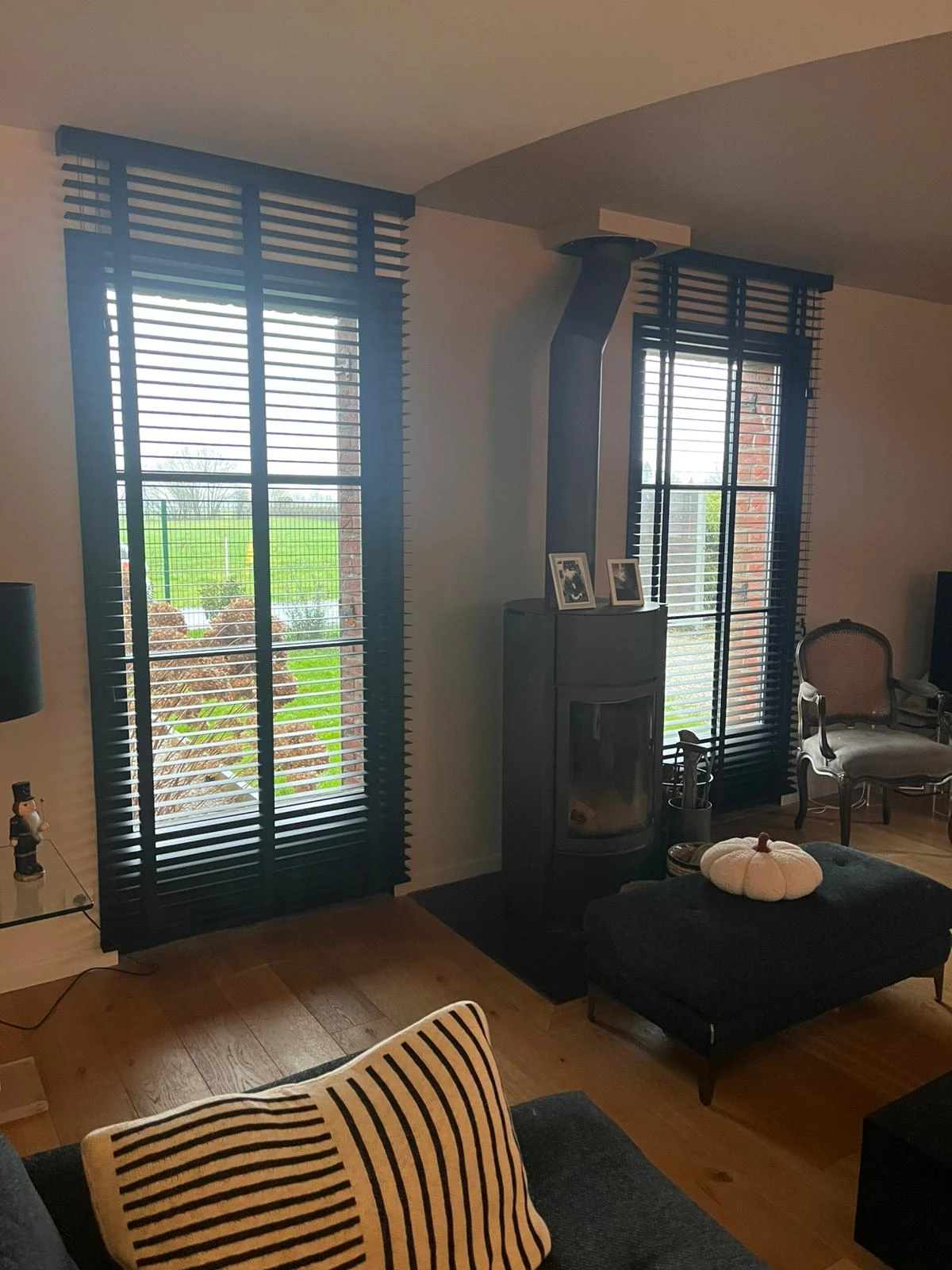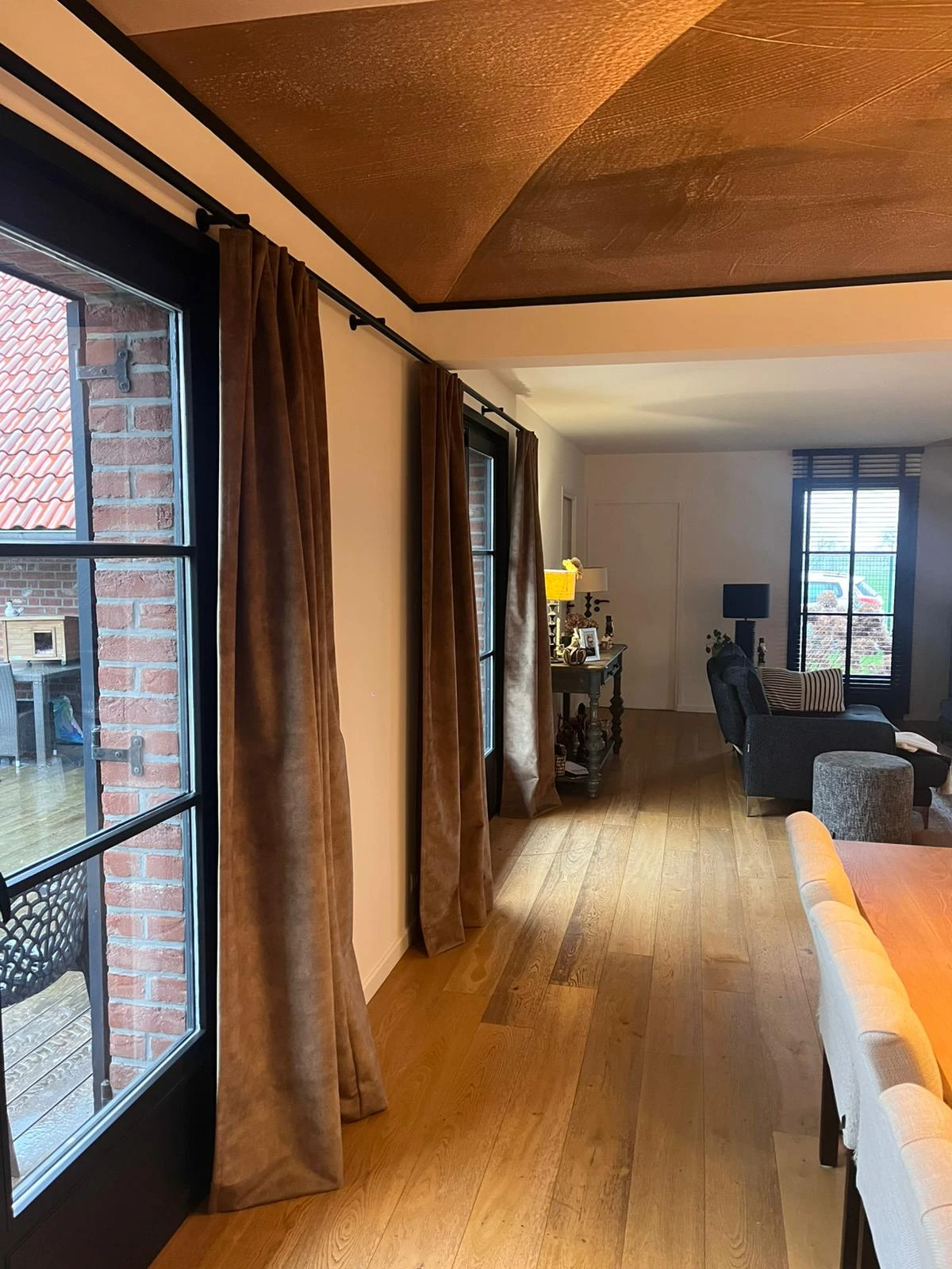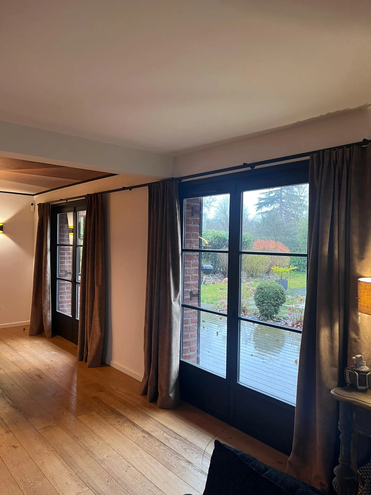 Pour habiller les ouvertures, nous avons installé des stores à lamelles en bois noir de la marque Contrejour, apportant caractère et modernité, ainsi qu’un rail noir de 6 mètres reliant visuellement la salle à manger et le salon. Les rideaux en velours Casamance viennent parfaire l’ensemble, offrant une touche chaleureuse et raffinée.