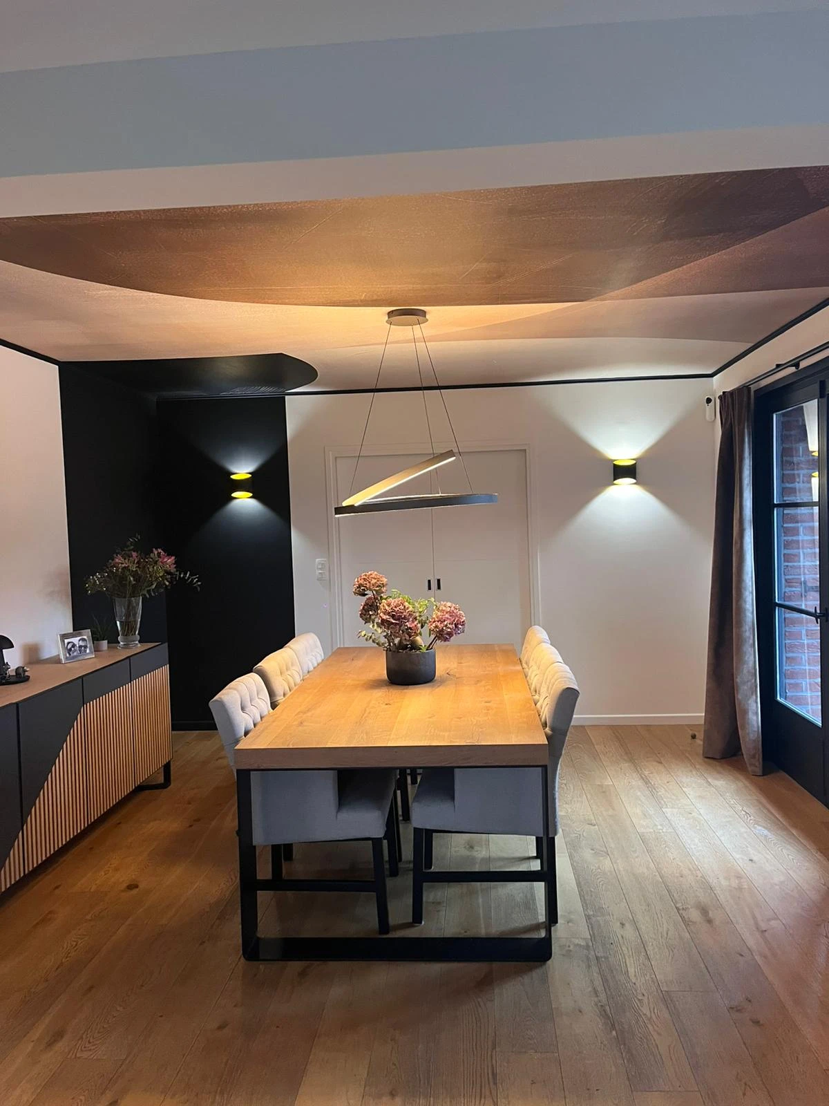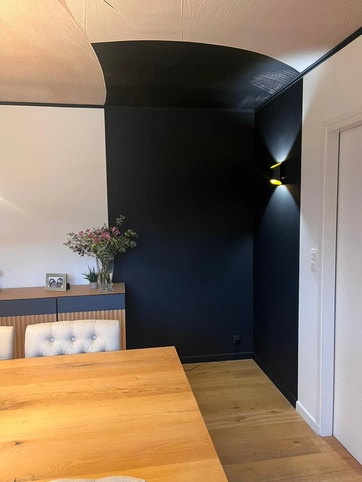 Dans la salle à manger, le parti pris est fort : la pose d’un panoramique de la marque Rebel Walls directement au plafond, sublimé par un cadre noir , à la manière d’un véritable tableau. Ce choix graphique apporte une identité unique à l’espace et attire immédiatement le regard. Pour renforcer l’effet waouh, une retombée noire dans l’angle, assortie au cadre, a été conçue pour donner l’illusion que le décor se prolonge et sort du cadre côté salon. Une mise en œuvre technique précise, maîtrisée de bout en bout par nos équipes.