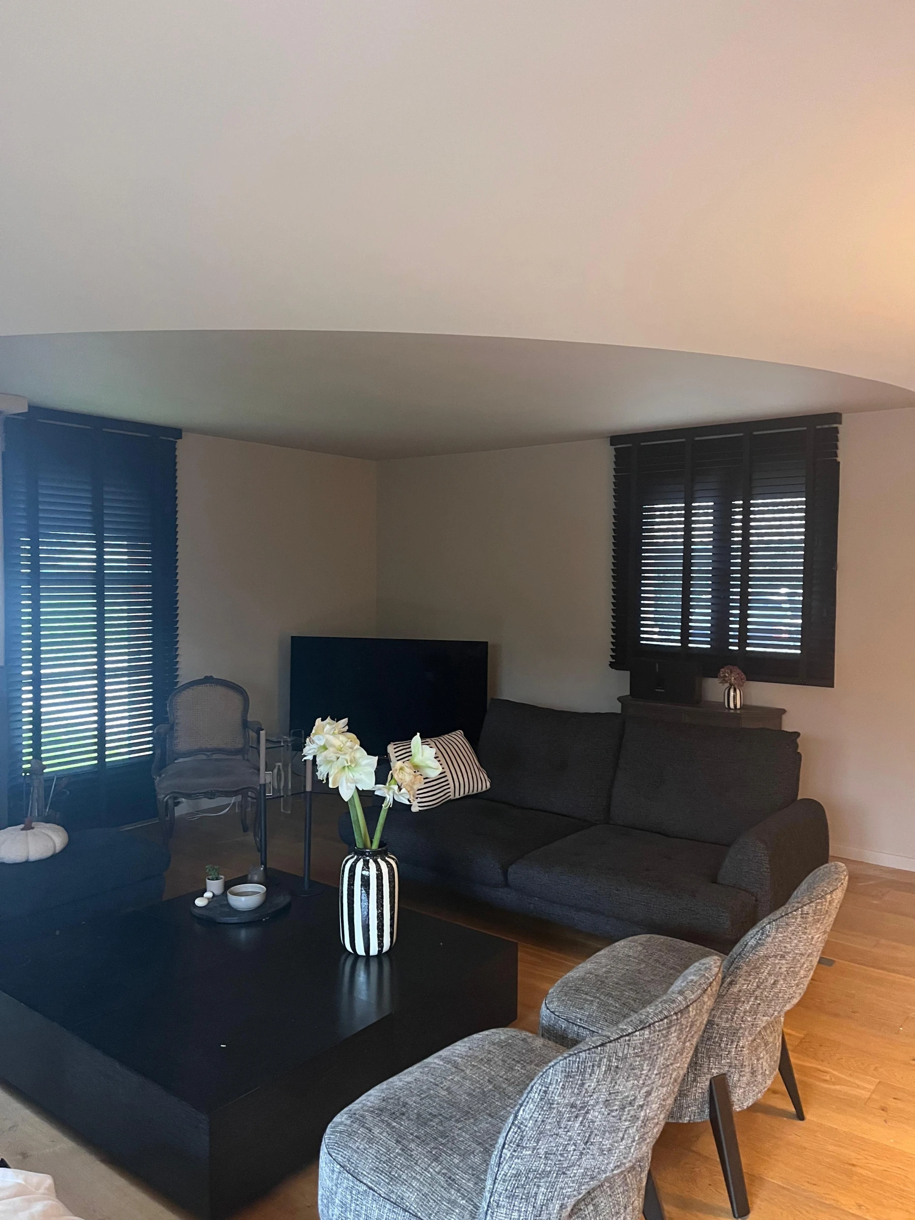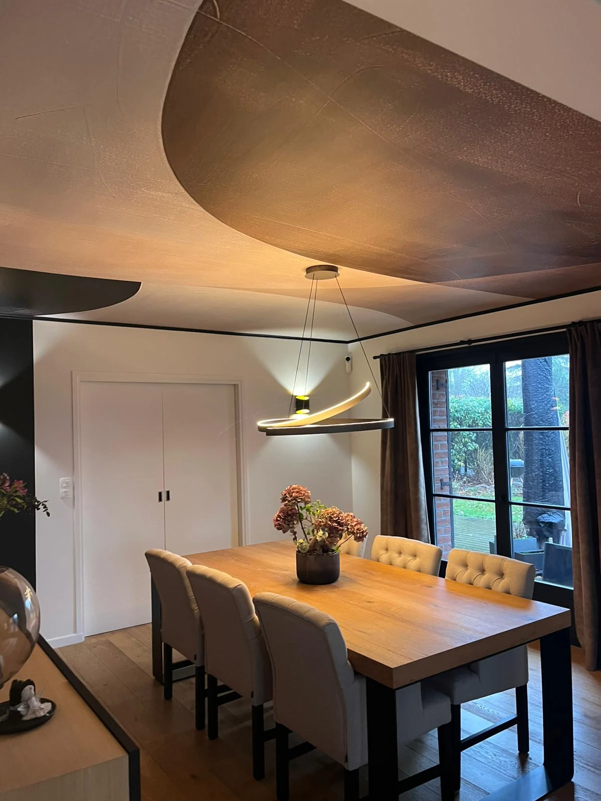 Côté salon, l’ambiance devient plus feutrée grâce à la création d’un demi-cercle au plafond, peint dans une teinte directement inspirée du panoramique Rebel Walls. Ce traitement des volumes adoucit les lignes, structure l’espace et crée une transition élégante entre les différentes zones de vie.