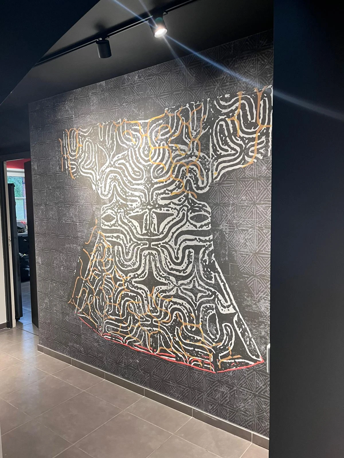 Dans l’entrée, place à l’originalité avec la pose d’un panoramique Elitis Kimono sur mesure. Ce décor fort affirme la personnalité du lieu dès les premiers pas et crée un véritable effet spectaculaire, signature de notre approche créative.