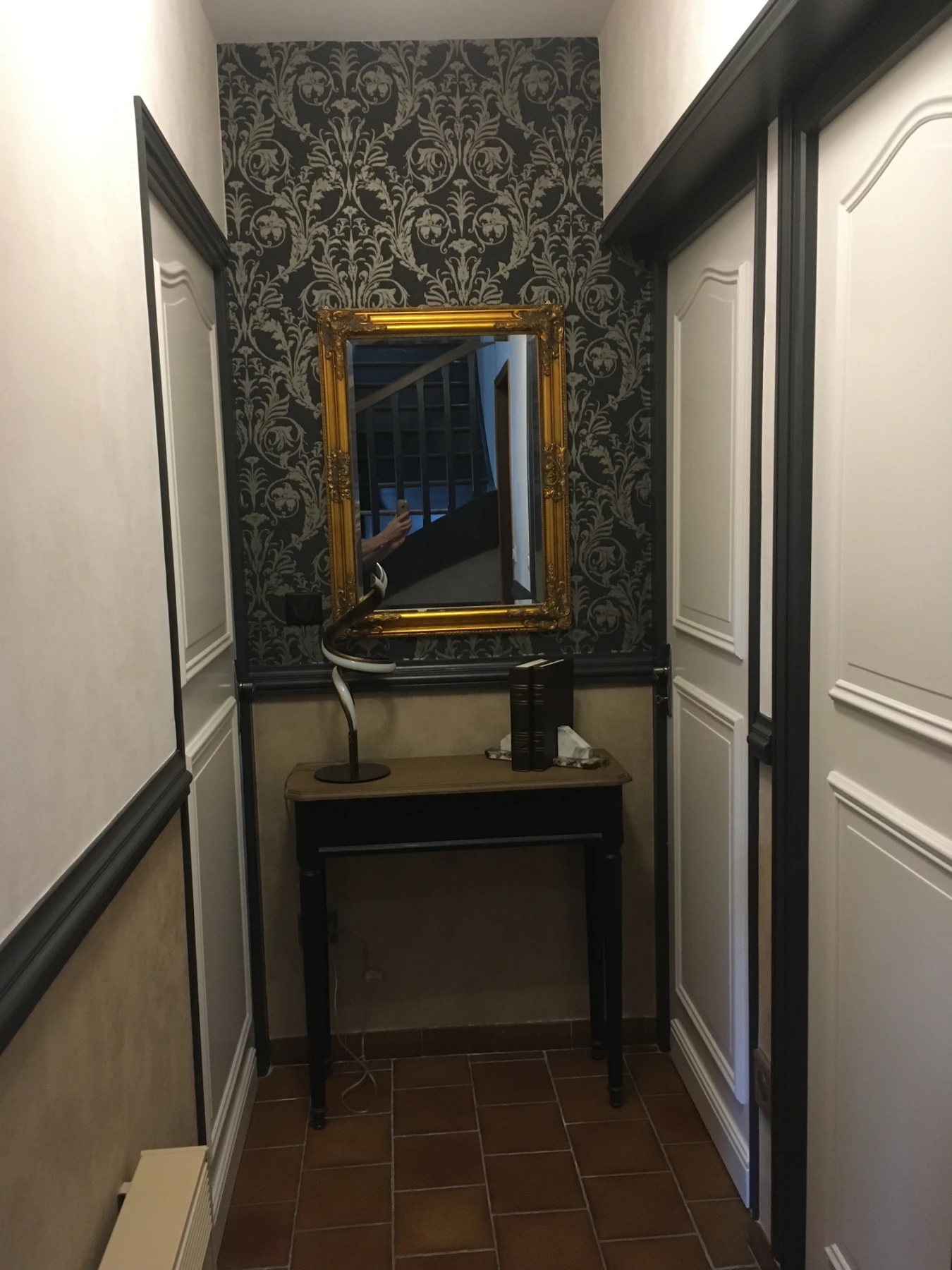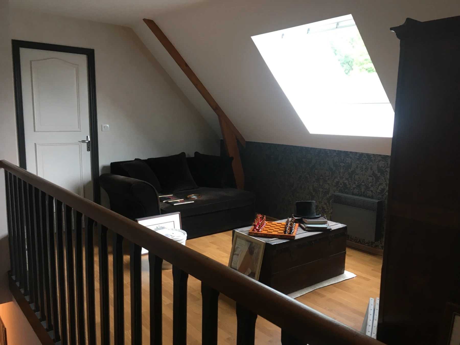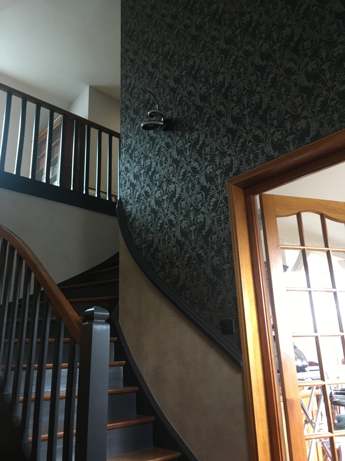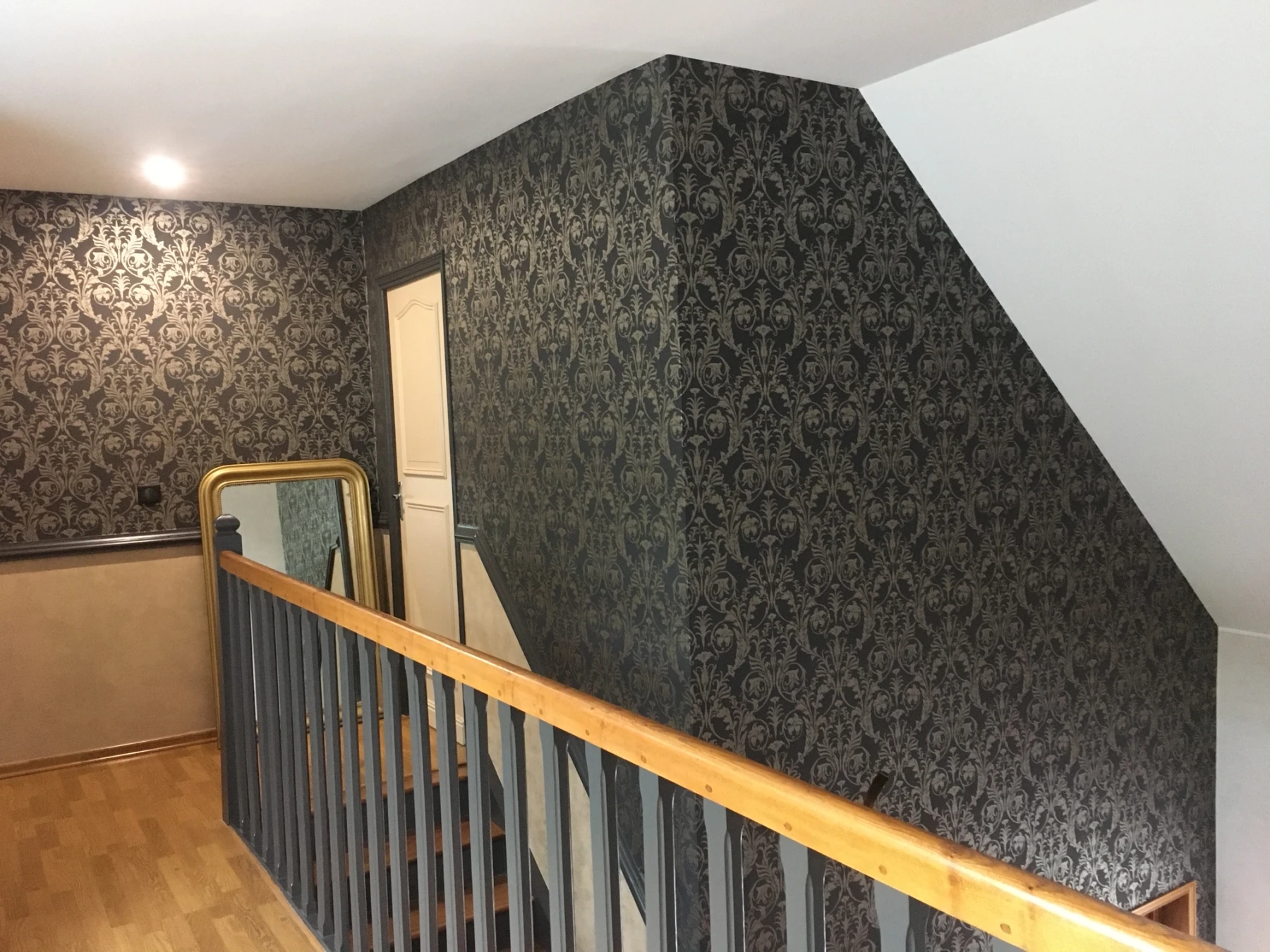 Le parti pris décoratif s’est appuyé sur un papier peint noir à motifs baroques noir et beiges dorés, apportant profondeur et élégance à l’ensemble. Cette toile de fond forte en personnalité contraste parfaitement avec les éléments tapissés de beige mordoré, créant un dialogue visuel entre modernité et classicisme. L’escalier en bois a été entièrement repeint dans des teintes foncées et mates, mettant en valeur la rampe et les marches avec raffinement.