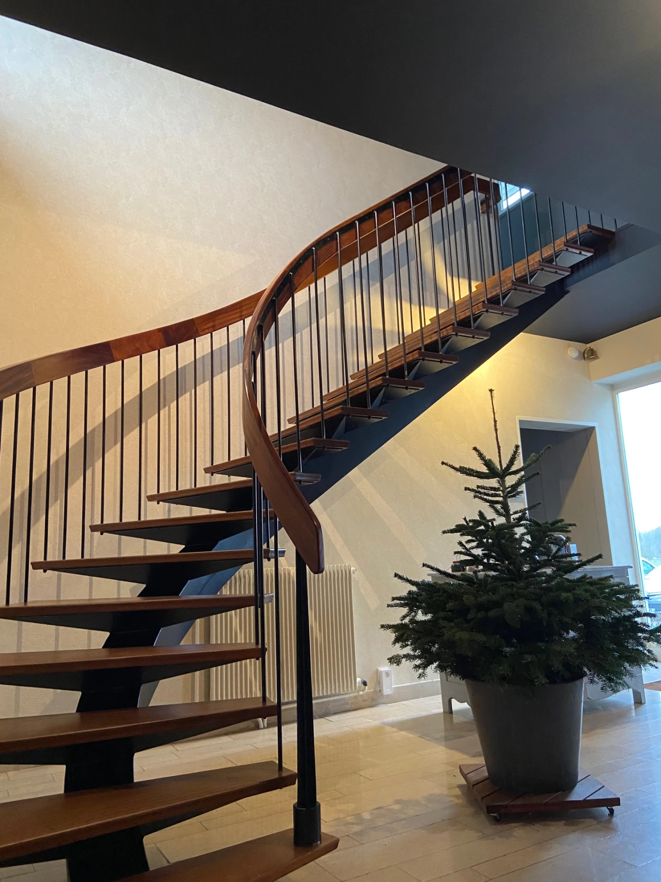 Le plafond a été habillé d’un noir profond mat, apportant un effet cocon et une touche résolument contemporaine. Le mur principal, souligné par l’escalier en bois courbé, a été recouvert d’un papier peint texturé à motifs graphiques discrets, jouant avec la lumière et créant du relief. Le contraste entre les matières (bois, noir, texture) et les teintes douces du reste de la pièce confère à ce hall d’entrée une atmosphère à la fois chaleureuse, élégante et structurée.