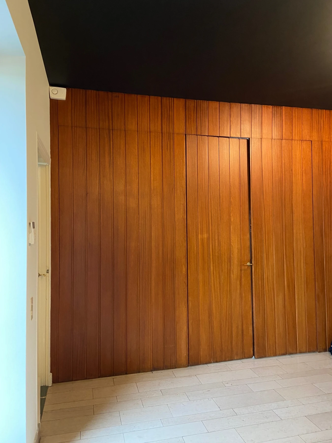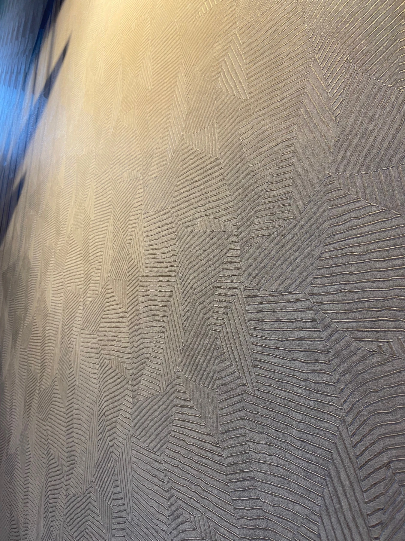 Nous accompagnons chaque client dans la définition de son ambiance intérieure, le choix des teintes, des textures et des revêtements muraux, puis assurons la mise en œuvre technique dans les règles de l’art. Ici, le mariage entre le plafond noir mat, les murs peints dans des tons clairs et la pose minutieuse du papier peint structuré illustre notre capacité à transformer un volume brut en un espace à vivre raffiné.