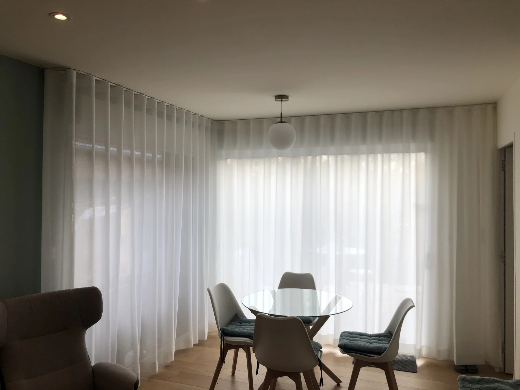 Dans le coin repas, un voilage finition vagues a été choisi pour son élégance et son tombé impeccable. Posé sur un rail cintré, il épouse parfaitement le caisson de la baie vitrée, offrant un rendu fluide et naturel. Le tissu haut de gamme Casamance, reconnu pour sa qualité et ses finitions irréprochables, a été sélectionné pour garantir un résultat durable et raffiné.