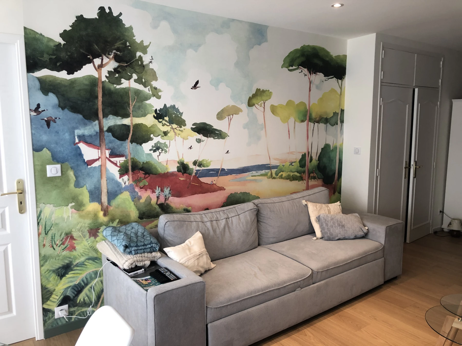 L’élément phare de cette réalisation est la pose du panoramique La Forêt de chez Isidore Leroy, spécialement réalisé sur mesure pour s’adapter parfaitement à l’espace salle à manger. Son graphisme raffiné évoque une promenade en pleine nature et s’harmonise subtilement avec les couleurs des murs. Grâce à notre expertise en projets personnalisés, nous avons pu proposer un accompagnement décoratif complet, mêlant choix des teintes, sélection du panoramique et conseils pour une ambiance chaleureuse et unique.