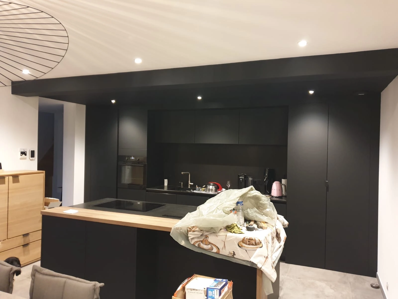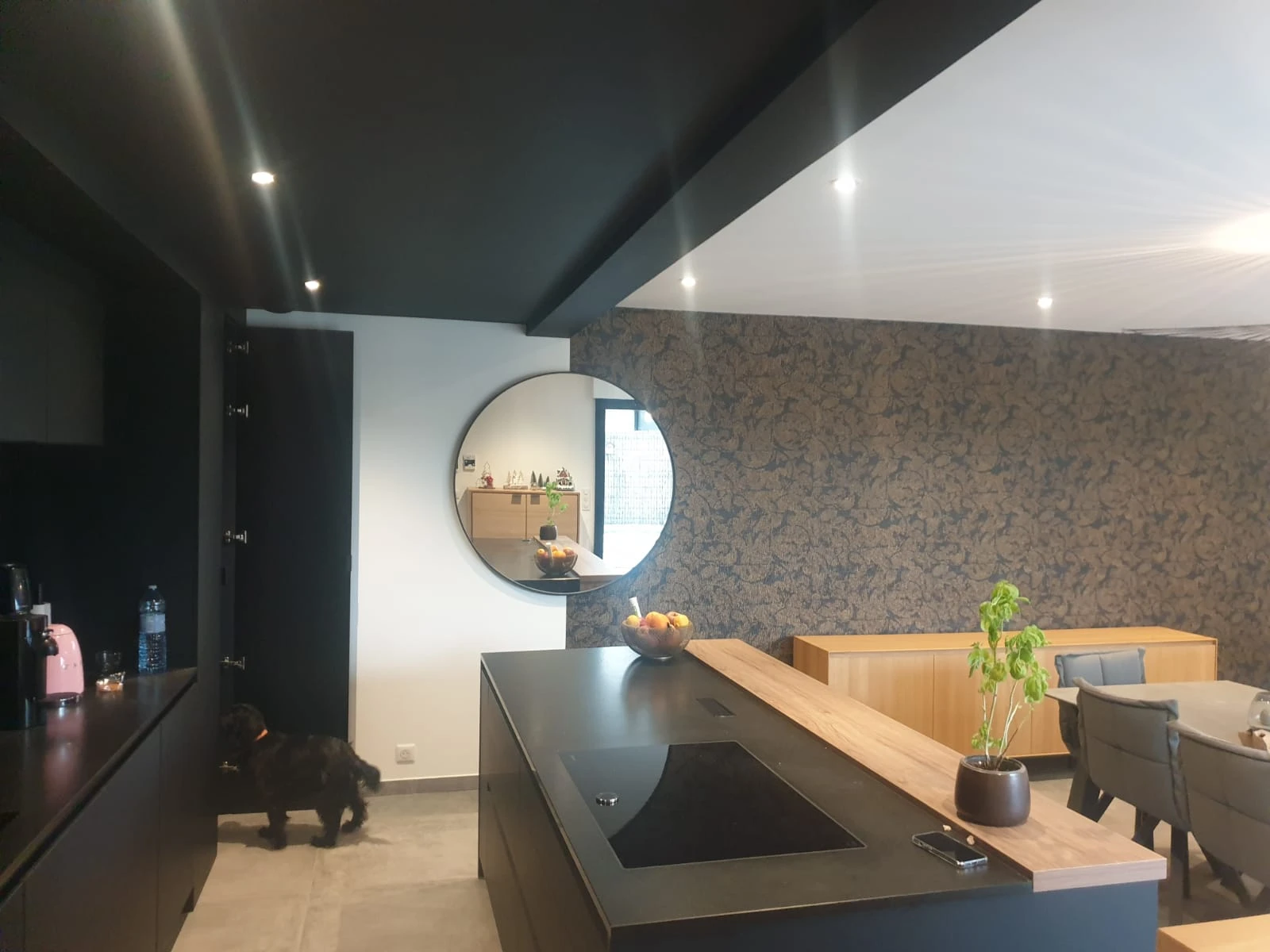 Dans la cuisine, nos décoratrices ont conseillé un plafond et un bandeau peints en noir, parfaitement coordonnés aux meubles existants. Ce choix audacieux met en valeur l’aménagement contemporain et crée une ambiance élégante et chaleureuse.