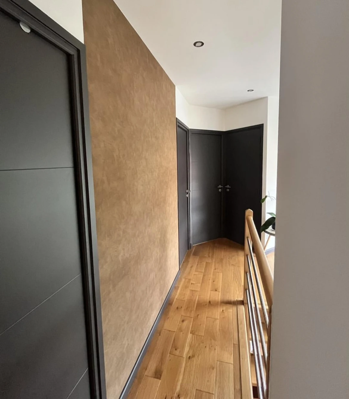 À l’étage, dans le couloir, nos artisans ont posé un papier peint effet chaux de Casamance, qui joue sur les matières pour apporter chaleur et caractère à cet espace de passage. Ce revêtement mural texturé s’intègre parfaitement à l’ensemble du projet, renforçant la cohérence esthétique de toute la maison.