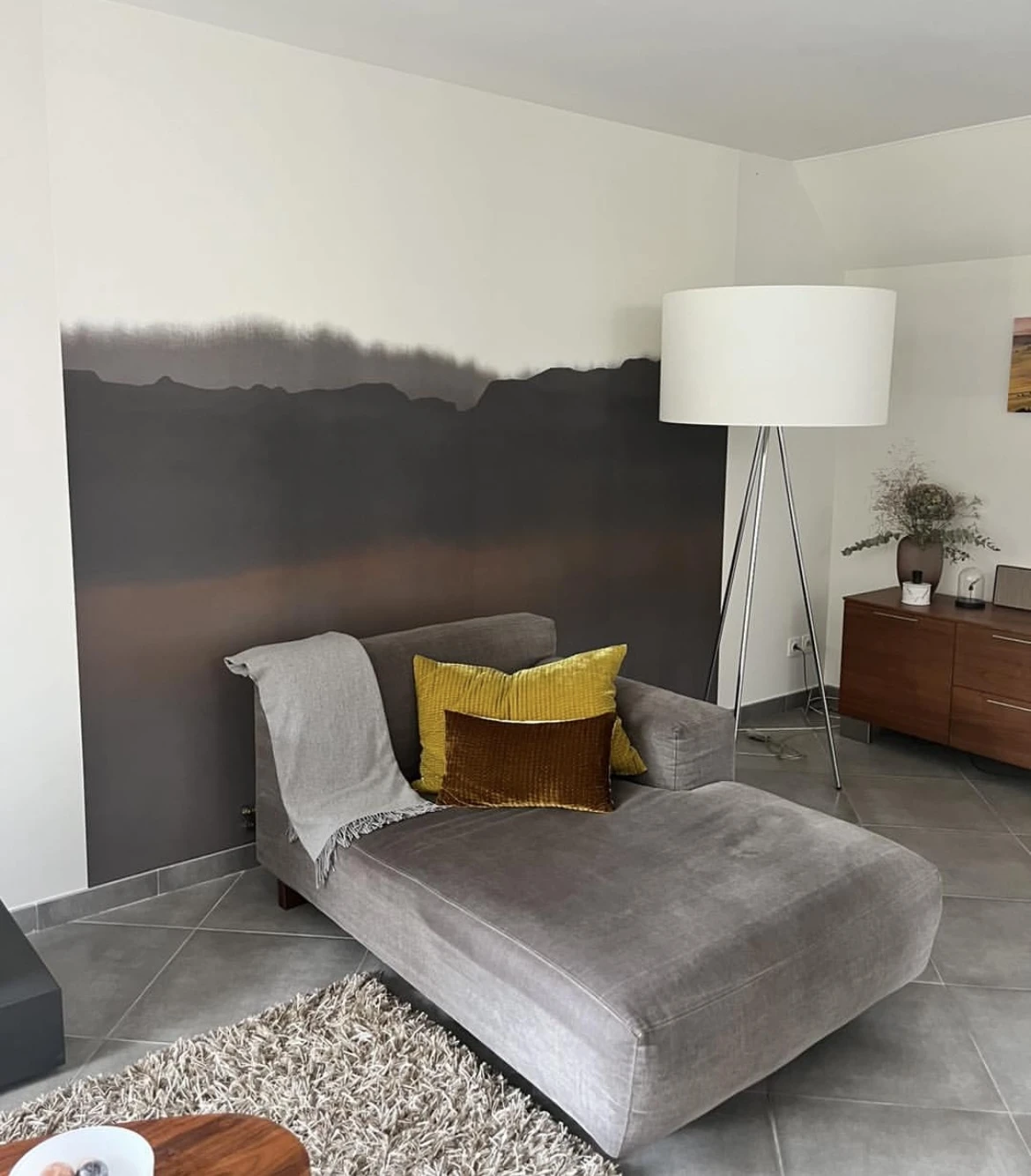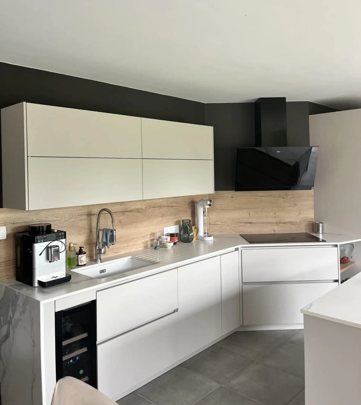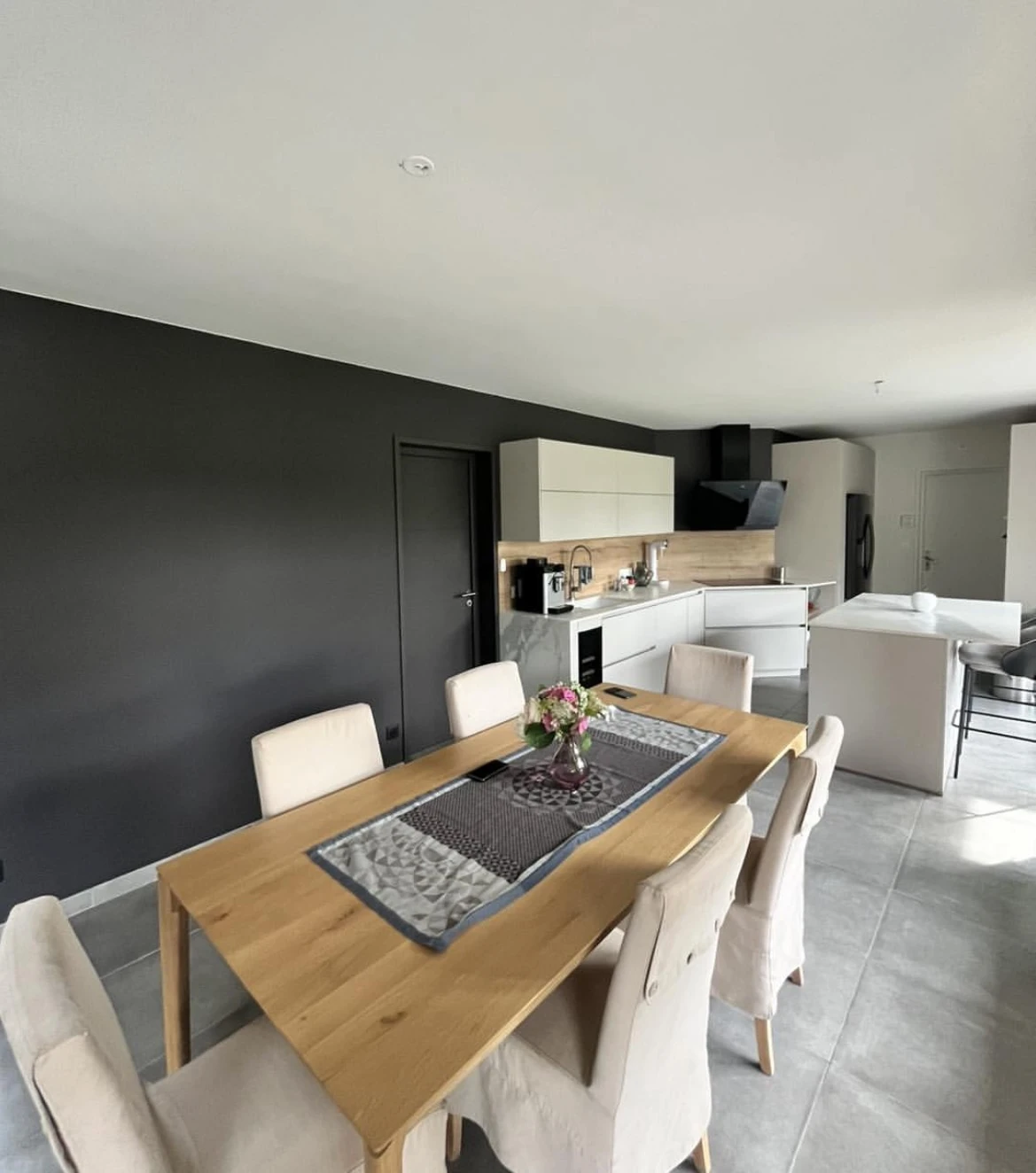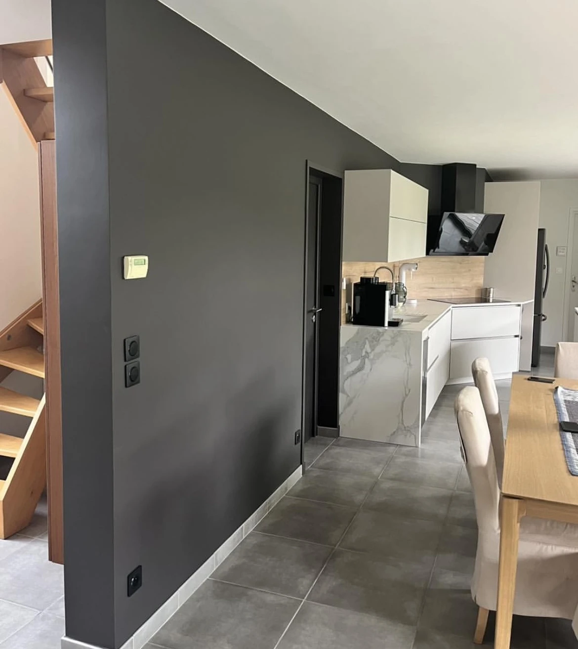 L’intervention ne s’est pas arrêtée au salon : la cuisine a bénéficié d’une peinture murale noire intense, appliquée avec finesse pour accentuer le style contemporain de l’espace. Ce choix audacieux, maîtrisé par notre équipe, crée un contraste élégant avec les tons clairs de la cuisine et souligne la modernité de l’aménagement.