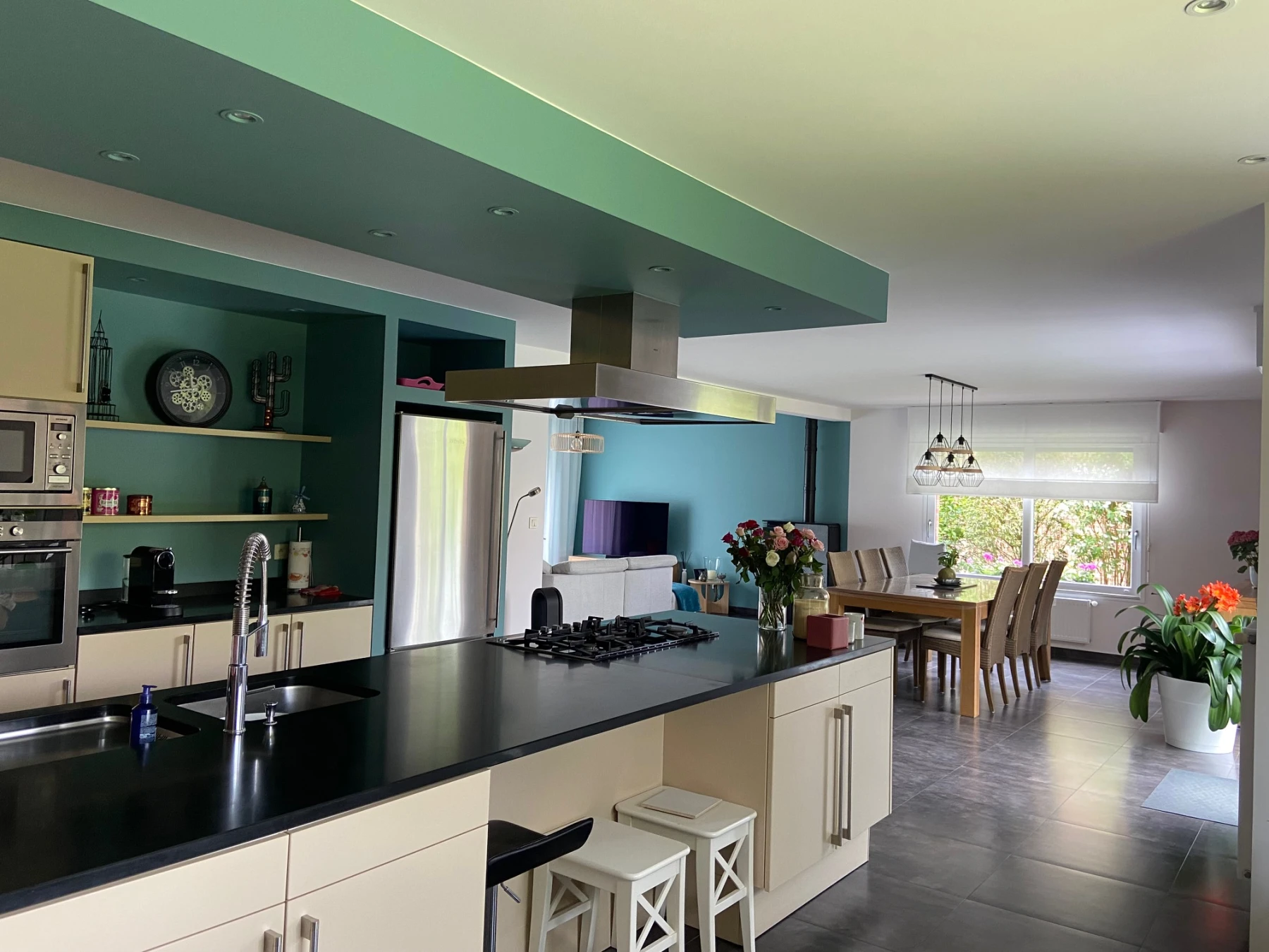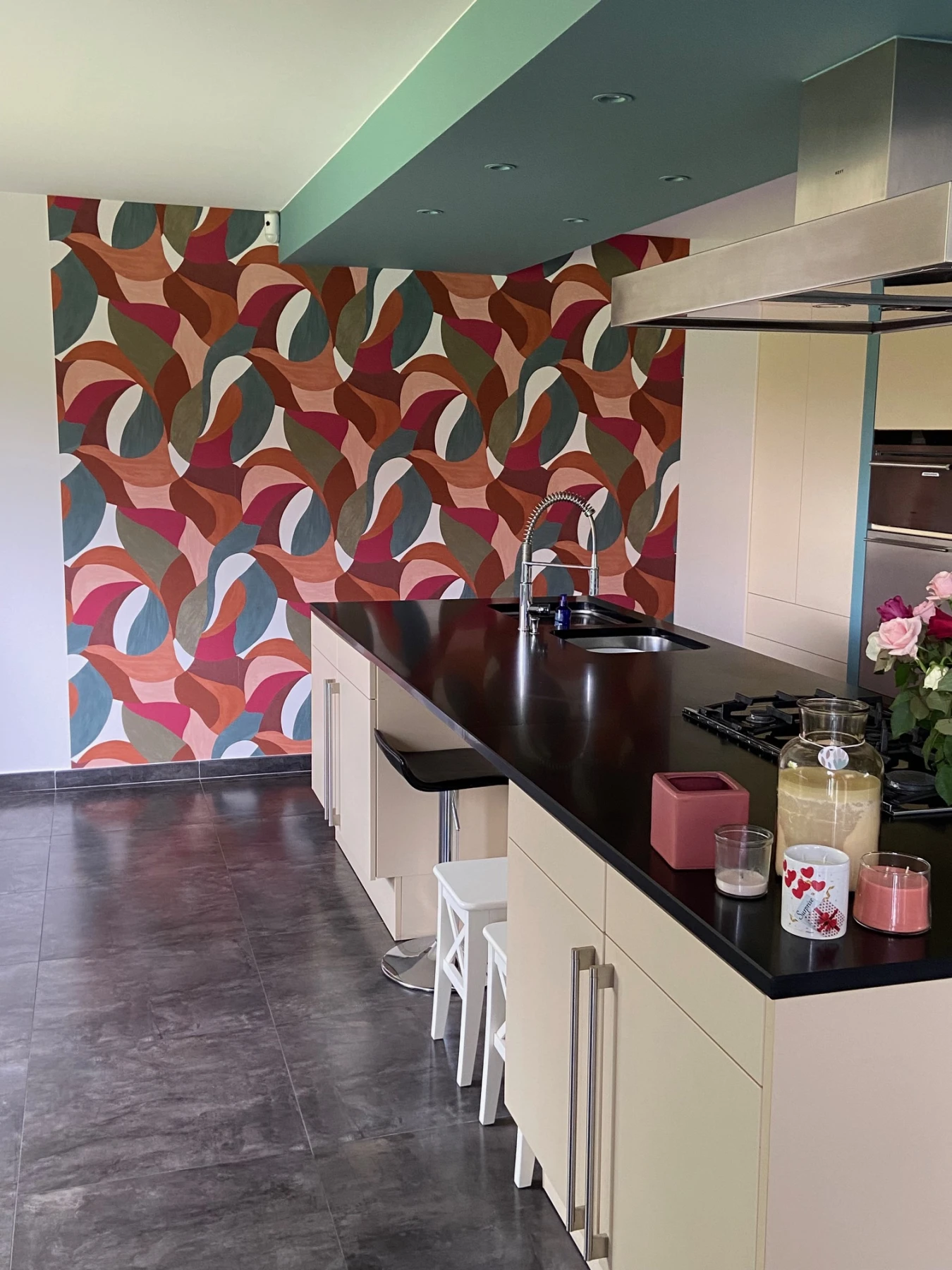 Dans la cuisine, le choix s’est porté sur un plafond bleu-vert, parfaitement assorti au papier peint Casamance MANDORLA, aux motifs dynamiques et aux couleurs chaleureuses. Ce mariage audacieux apporte une ambiance contemporaine et raffinée à la pièce, tout en créant un véritable espace de vie convivial.