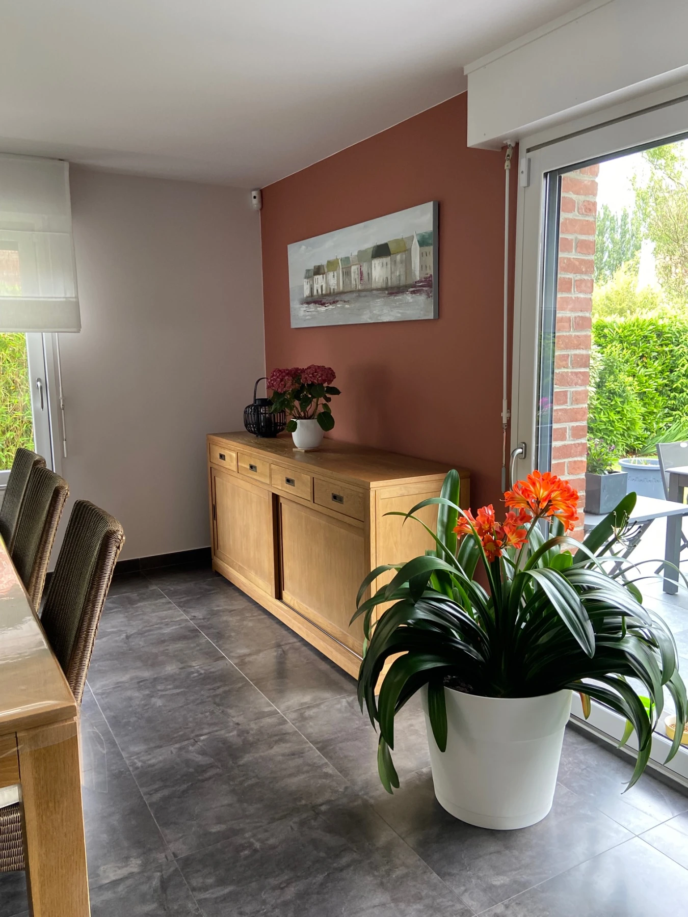 Dans la salle à manger, une teinte chaude a été appliquée pour rappeler l’une des couleurs du papier peint, assurant une harmonie visuelle entre les espaces. Enfin, dans le salon, une couleur subtilement coordonnée vient parfaire cet équilibre décoratif, renforçant la cohérence des différentes pièces.