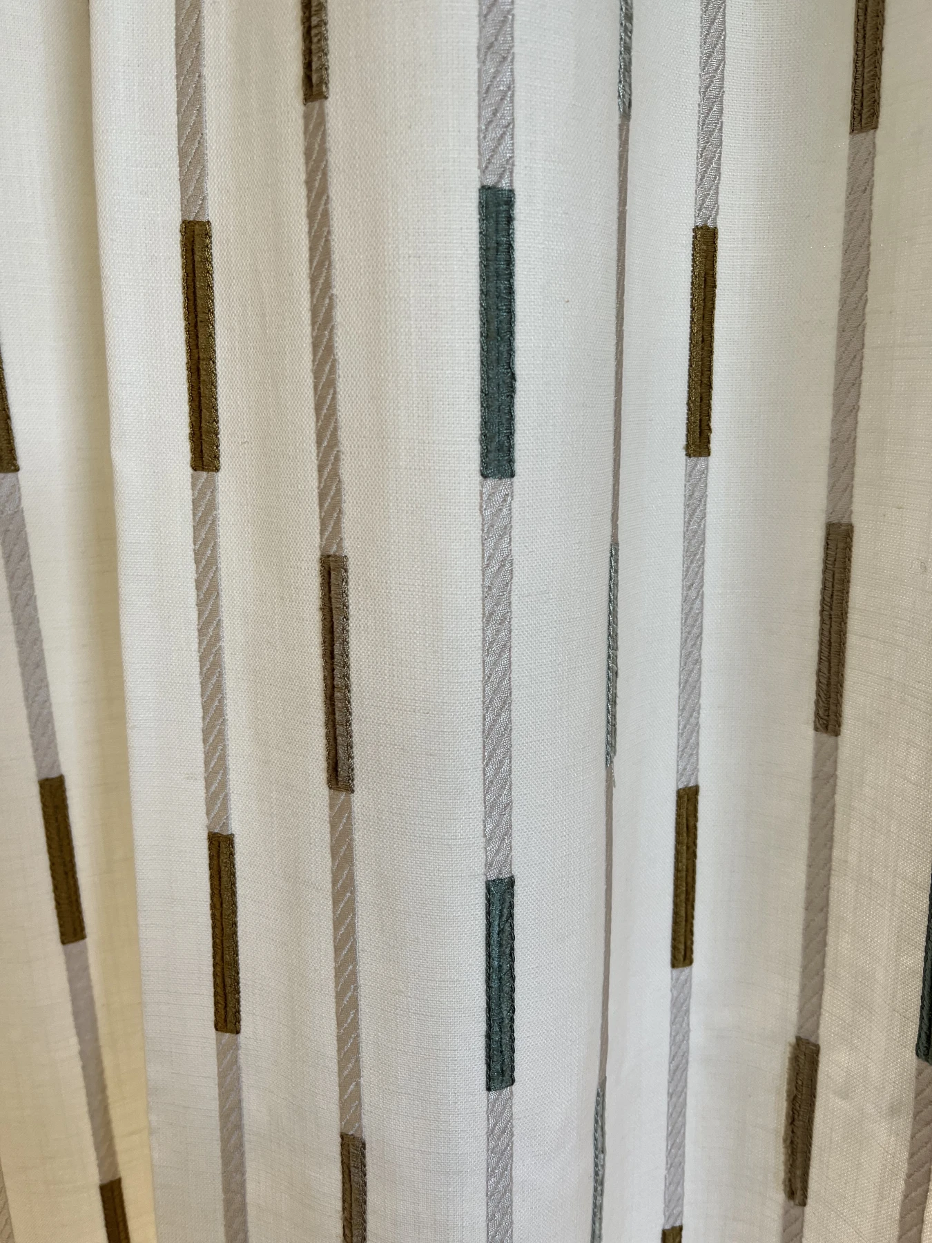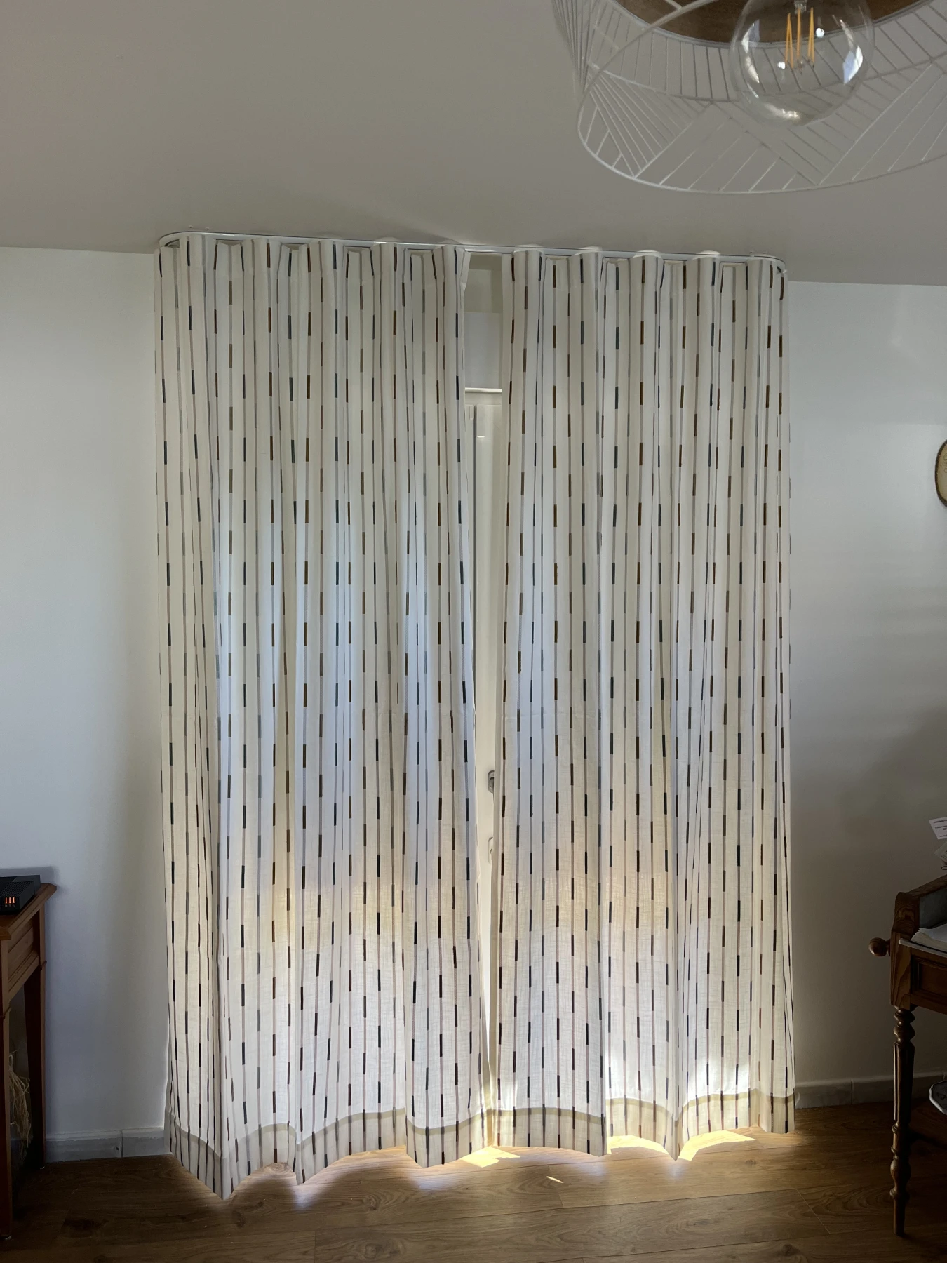 Nous avons confectionné des rideaux sur mesure aux tons clairs subtilement ponctués de touches colorées,de la marque Camengo apportant modernité et légèreté à la pièce. Leur tombé impeccable est assuré par une finition vagues, reconnue pour sa ligne fluide et régulière, idéale pour créer une ambiance à la fois chaleureuse et contemporaine.