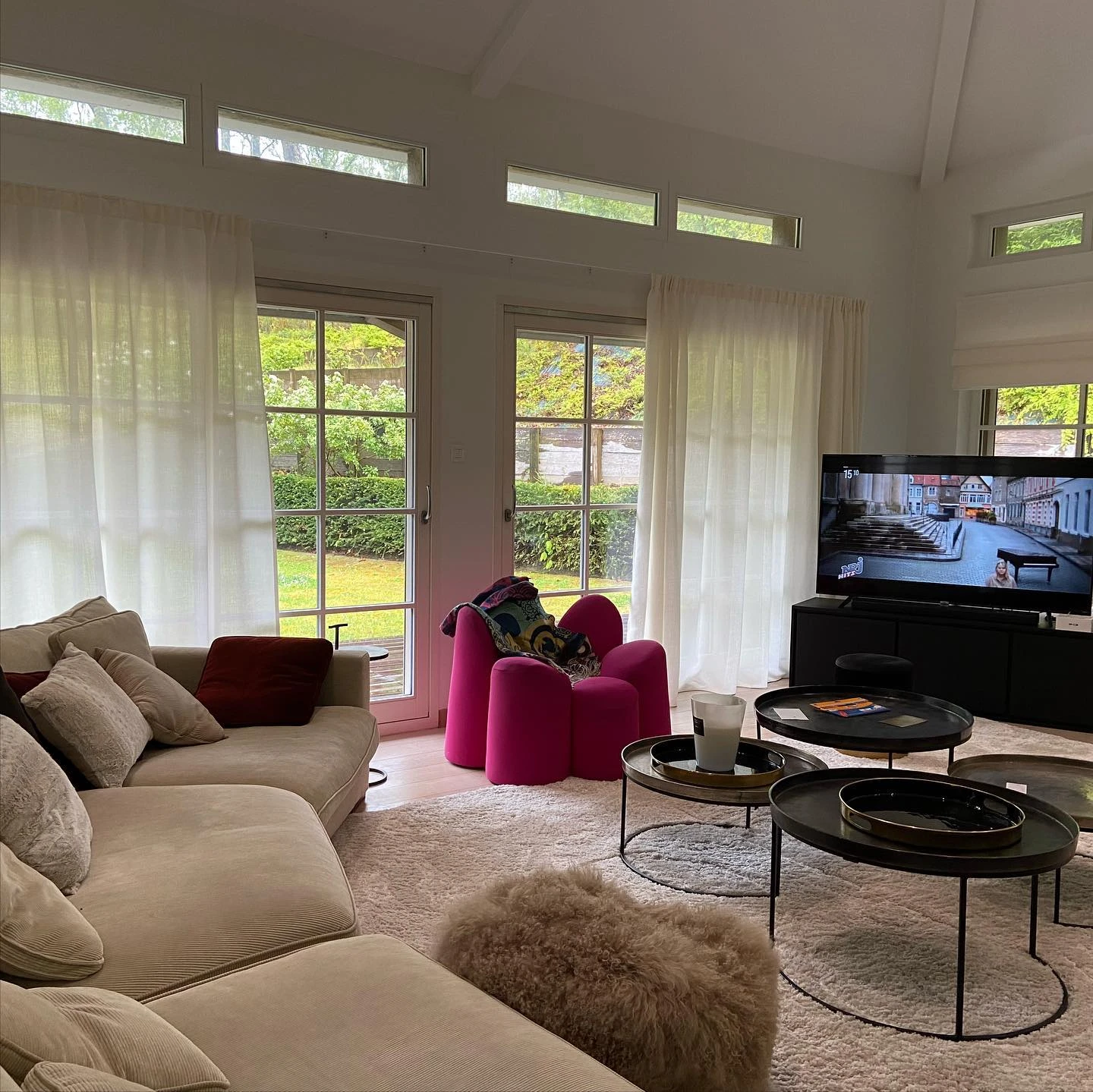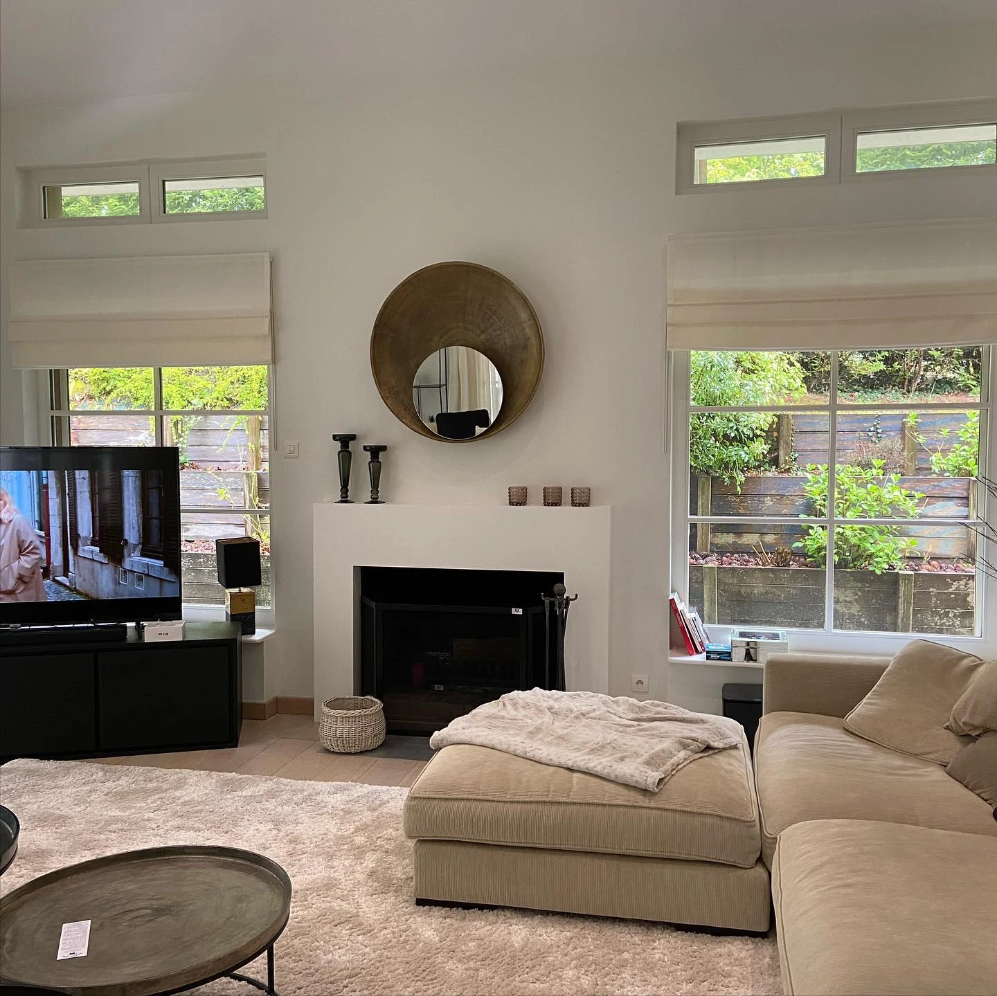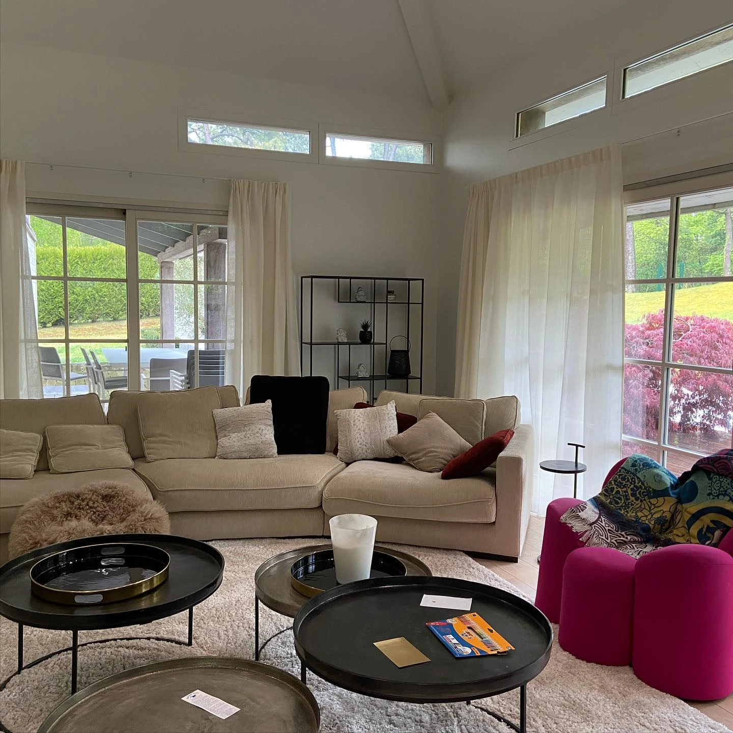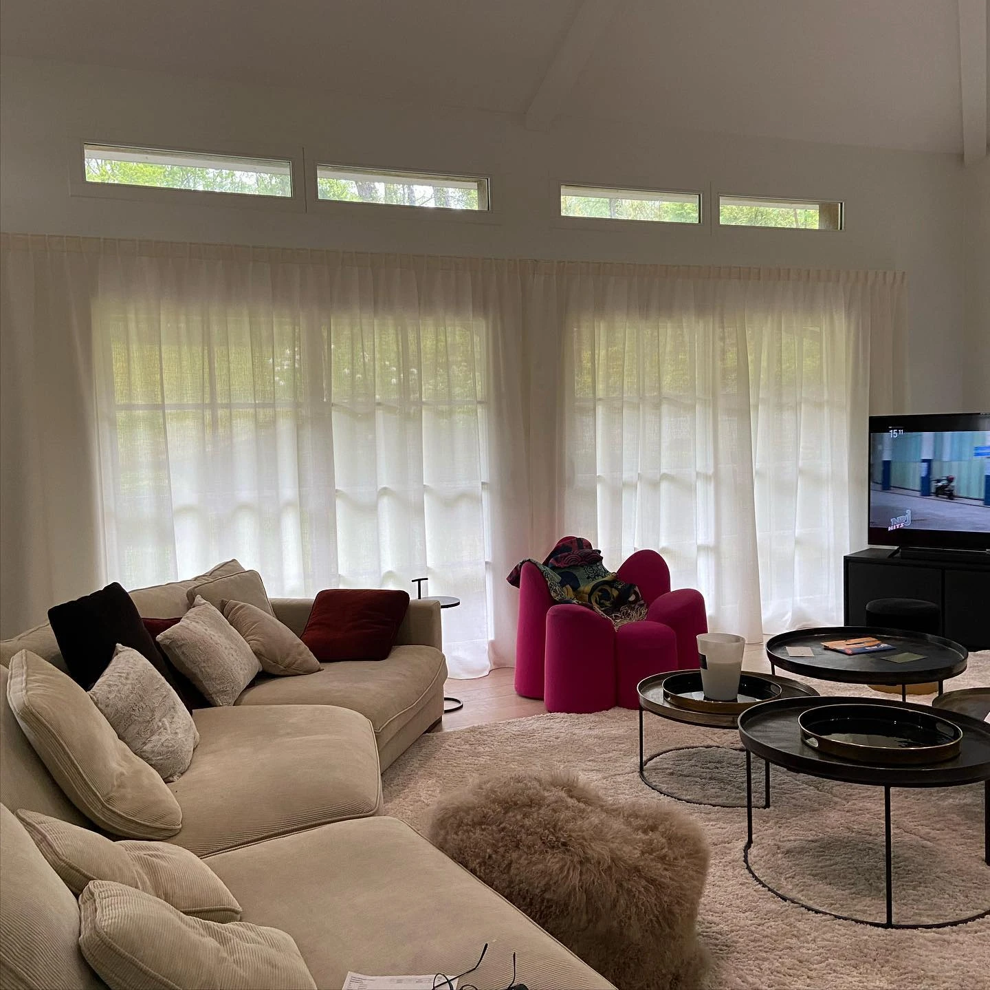 Ce salon spacieux aux lignes contemporaines nécessitait un habillage textile discret mais raffiné. Nos voilages blancs cassés ont été choisis pour leur légèreté et leur tombé fluide, afin de filtrer la lumière sans alourdir l’espace. L’intégration des rideaux pleine hauteur vient accentuer l’effet de volume tout en apportant une note de confort et de douceur à l’ensemble. Chaque confection a été réalisée sur mesure, en tenant compte de la hauteur sous plafond et de la configuration des ouvertures.