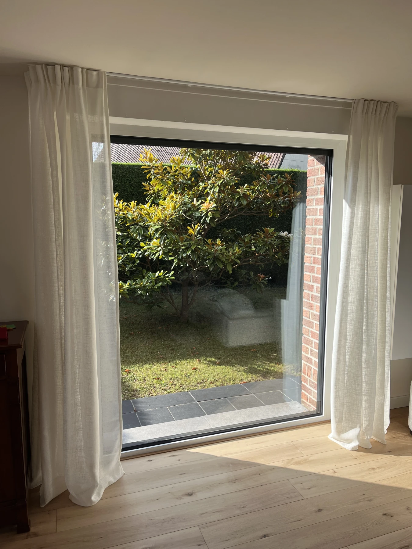 L’une des spécificités de ce projet réside dans la pose sur rails cintrés, parfaitement étudiés pour épouser la forme des caissons de volets roulants. Cette installation technique, réalisée avec précision, démontre toute l’expertise de notre équipe. Nous veillons à concevoir des solutions sur mesure, parfaitement adaptées à la configuration des lieux, pour un rendu esthétique irréprochable et une manipulation fluide au quotidien.
