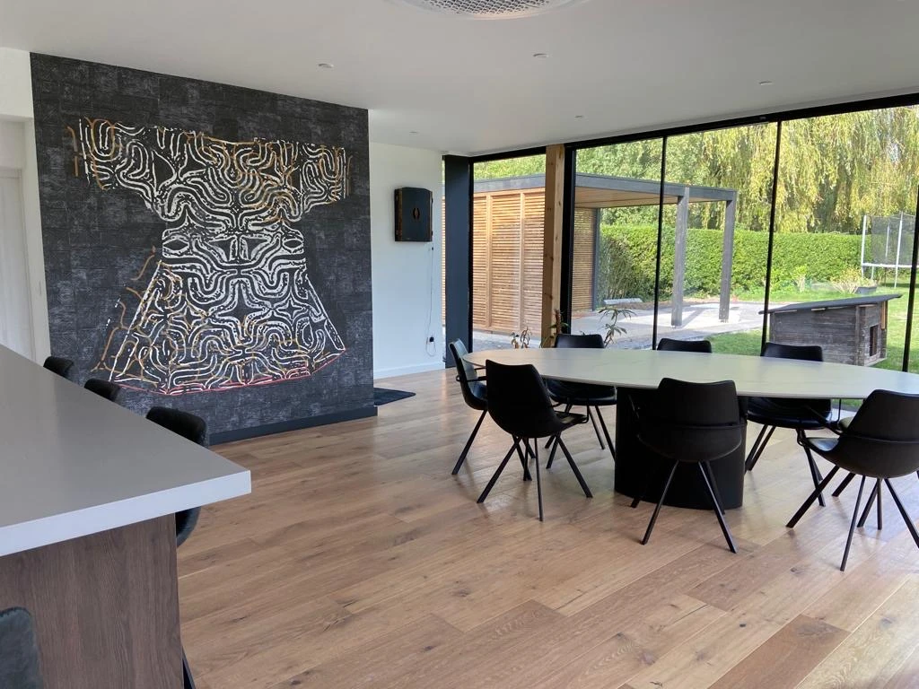 Pour la salle à manger, nos décoratrices ont imaginé un mur spectaculaire grâce au panoramique Kimono de chez Elitis. Ce décor graphique et audacieux transforme l’espace en véritable tableau d’art mural, apportant une touche artistique et moderne à la pièce. Associé aux grandes baies vitrées, il crée une atmosphère conviviale et design, parfaitement harmonisée avec le reste de la décoration.