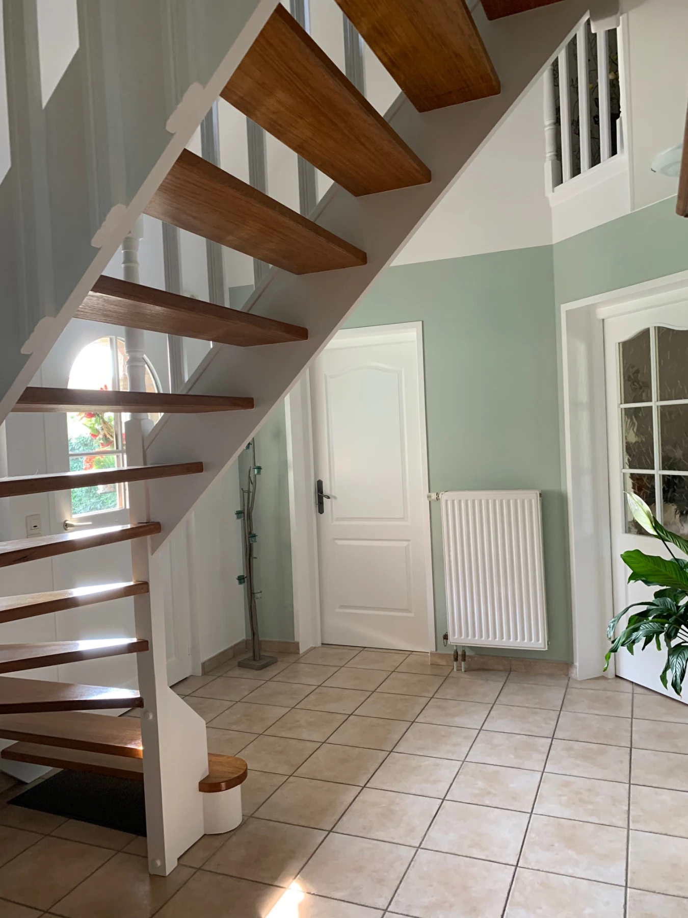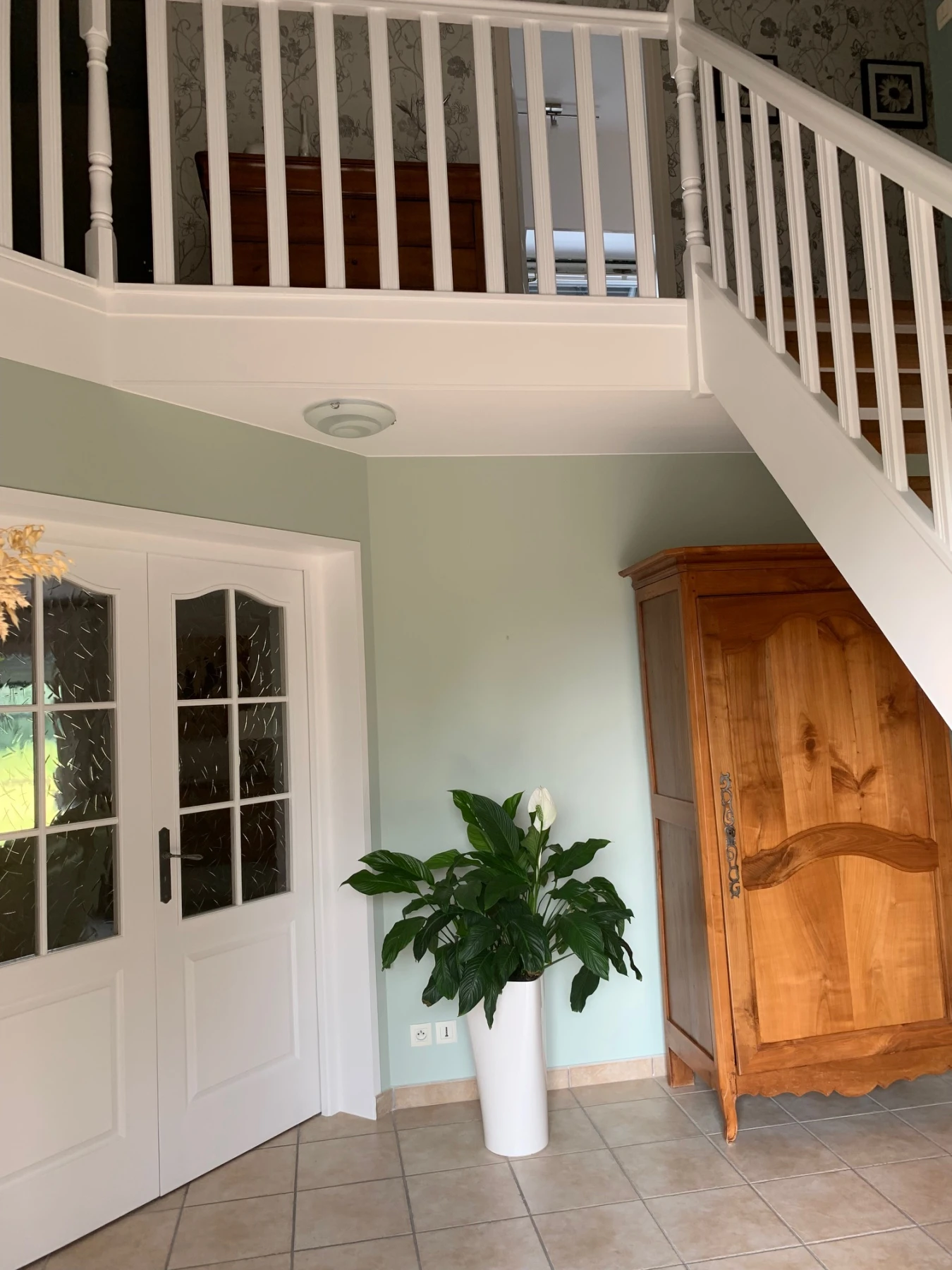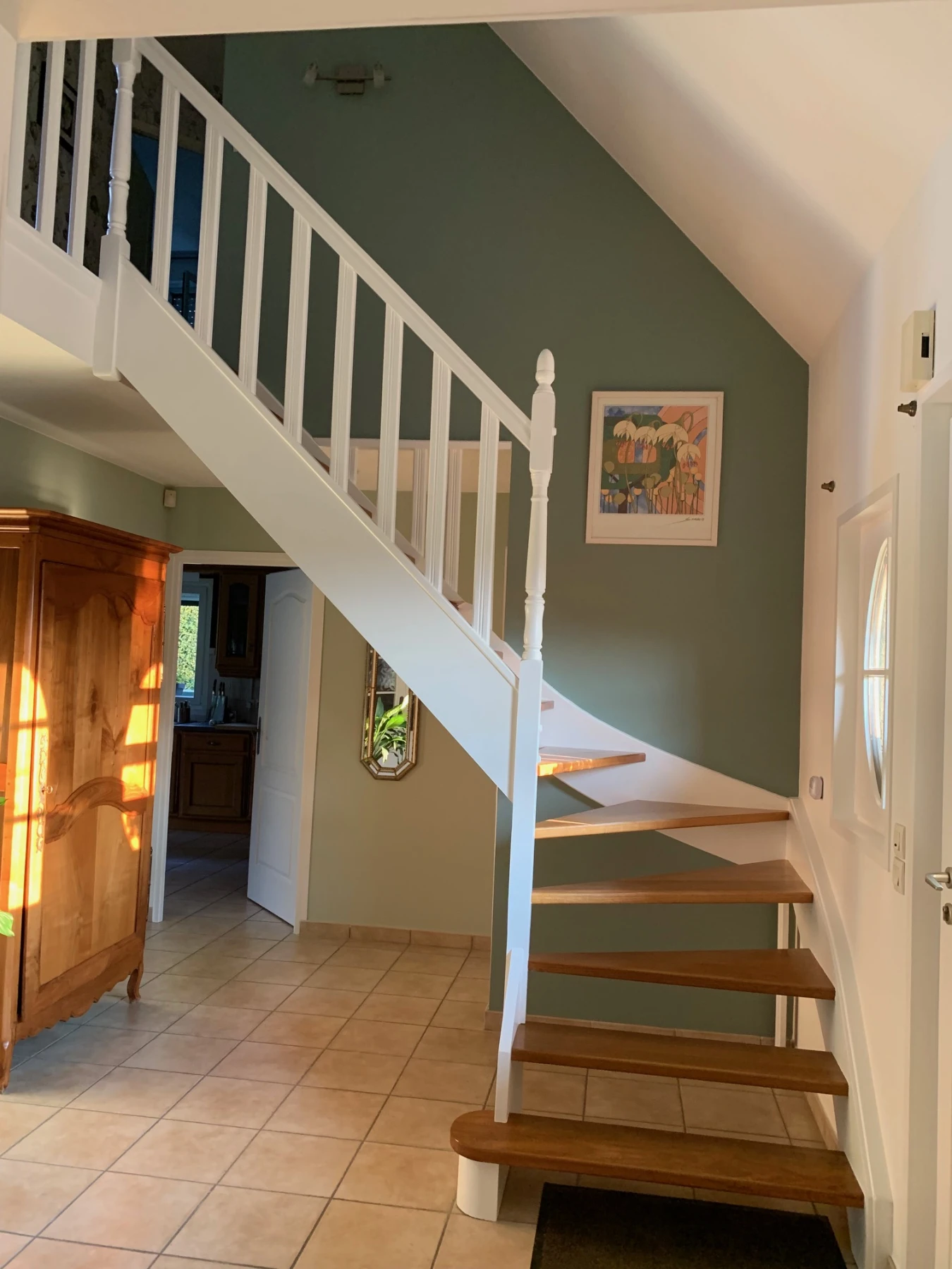 Le choix d’un ton vert apaisant pour les murs permet de créer une ambiance chaleureuse dès l’entrée tout en conservant une belle sobriété visuelle. Le blanc des rampes et contremarches d’escalier redonne de l’éclat à la structure, tandis que les marches bois ont été soigneusement conservées pour apporter une note naturelle et authentique à l’ensemble.