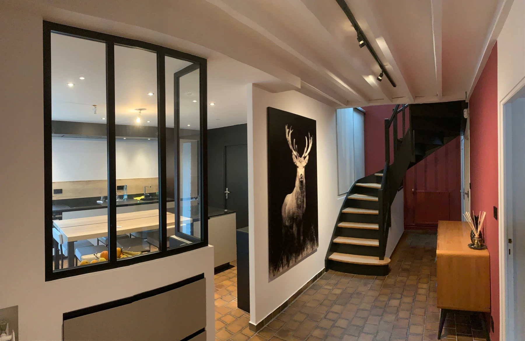 Entrée : mise en peinture de l'escalier en double ton noir et naturel , plafond fondu dans la teinte des murs, ajout de 2 murs coloris brique pour apporter un peu de chaleur et de chic.
