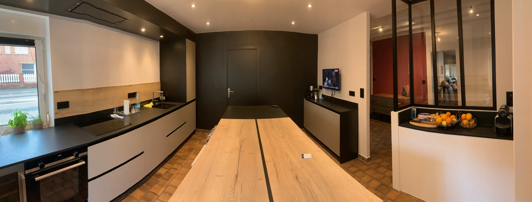 Cuisine : réalisation des peintures en coordonné avec l'entrée, plafond décaissé noir au dessus des meubles de cuisine.