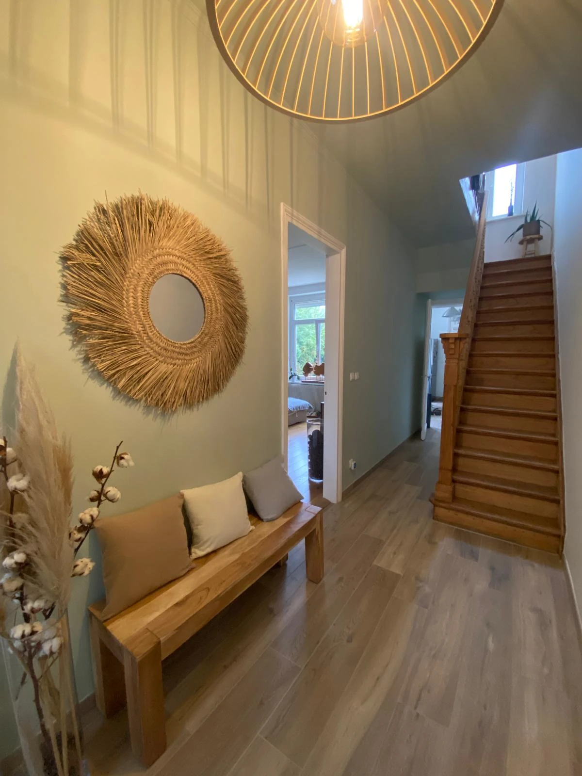 L'escalier est resté naturel pour réchauffer, l'apport de la déco en bois et les matières naturelles comme le raphia et le bois donne une touche légère et apaisante.
