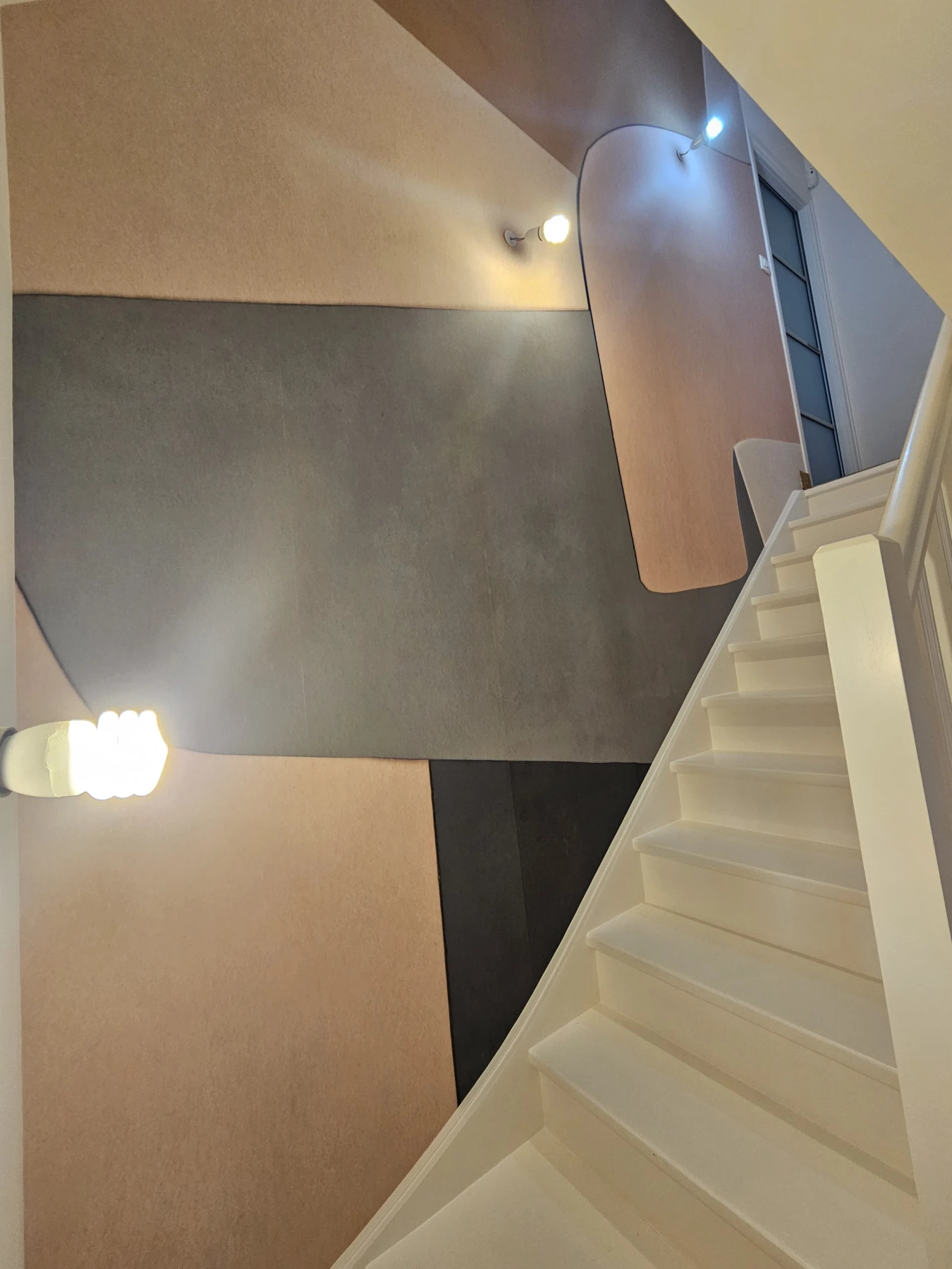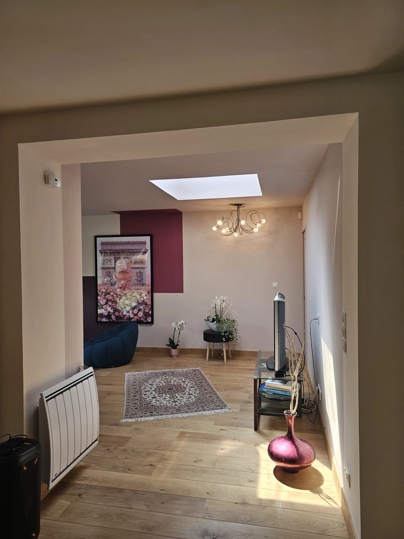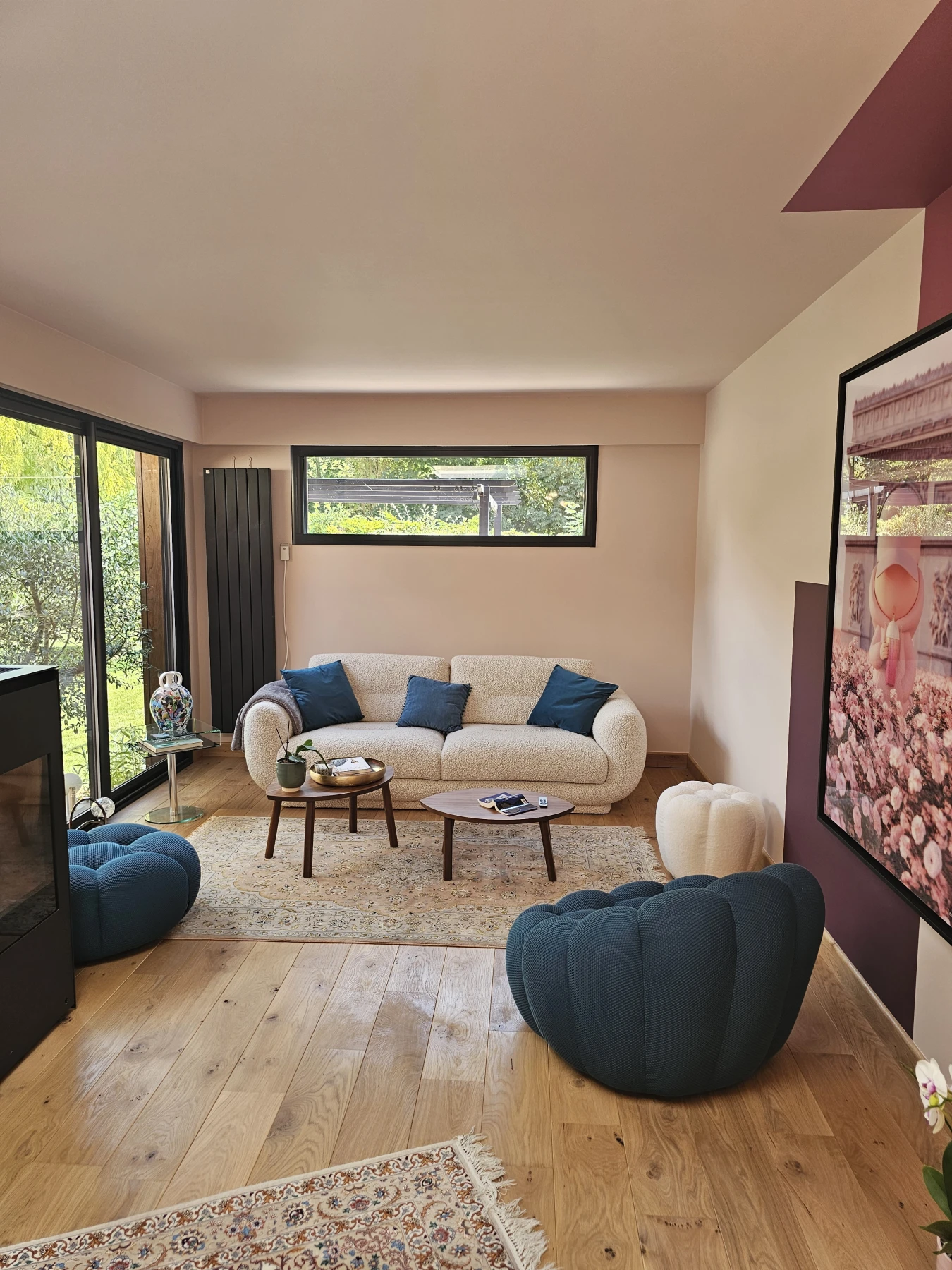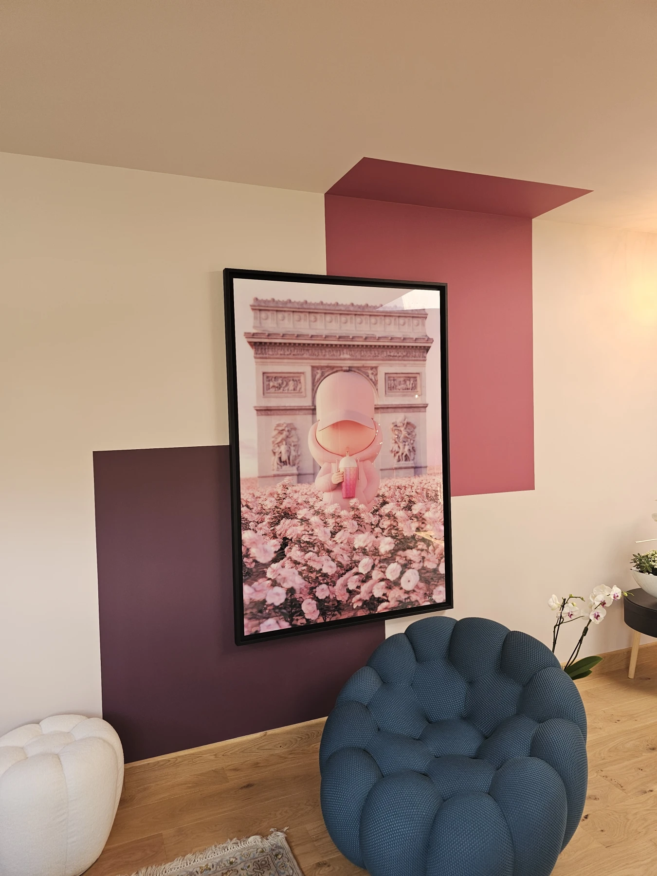 Dans le séjour, un jeu de formes géométriques peintes encadre le tableau et le transforme en véritable élément central de la décoration. Les teintes rosées et le faux noir s’équilibrent avec douceur, créant une ambiance contemporaine et raffinée.