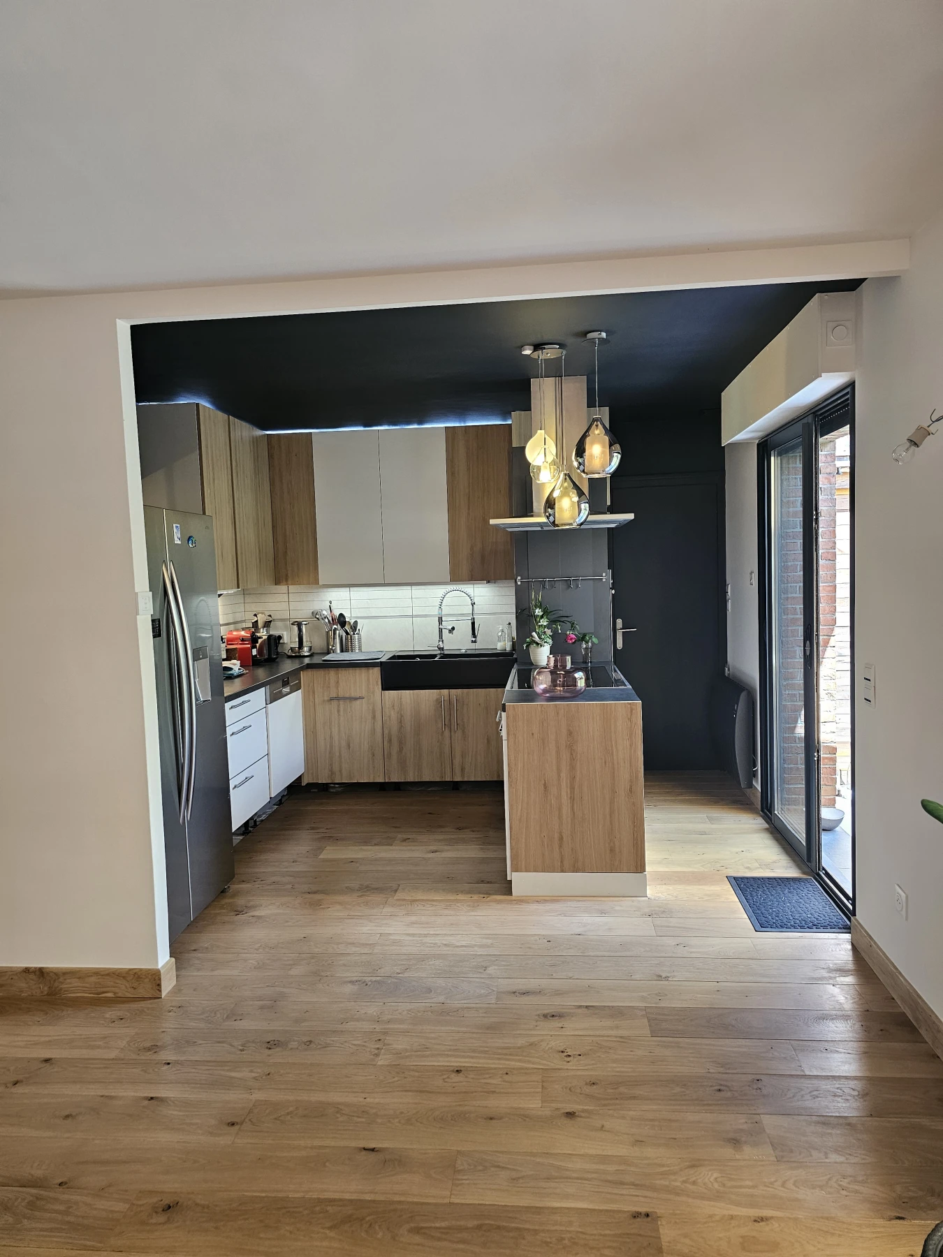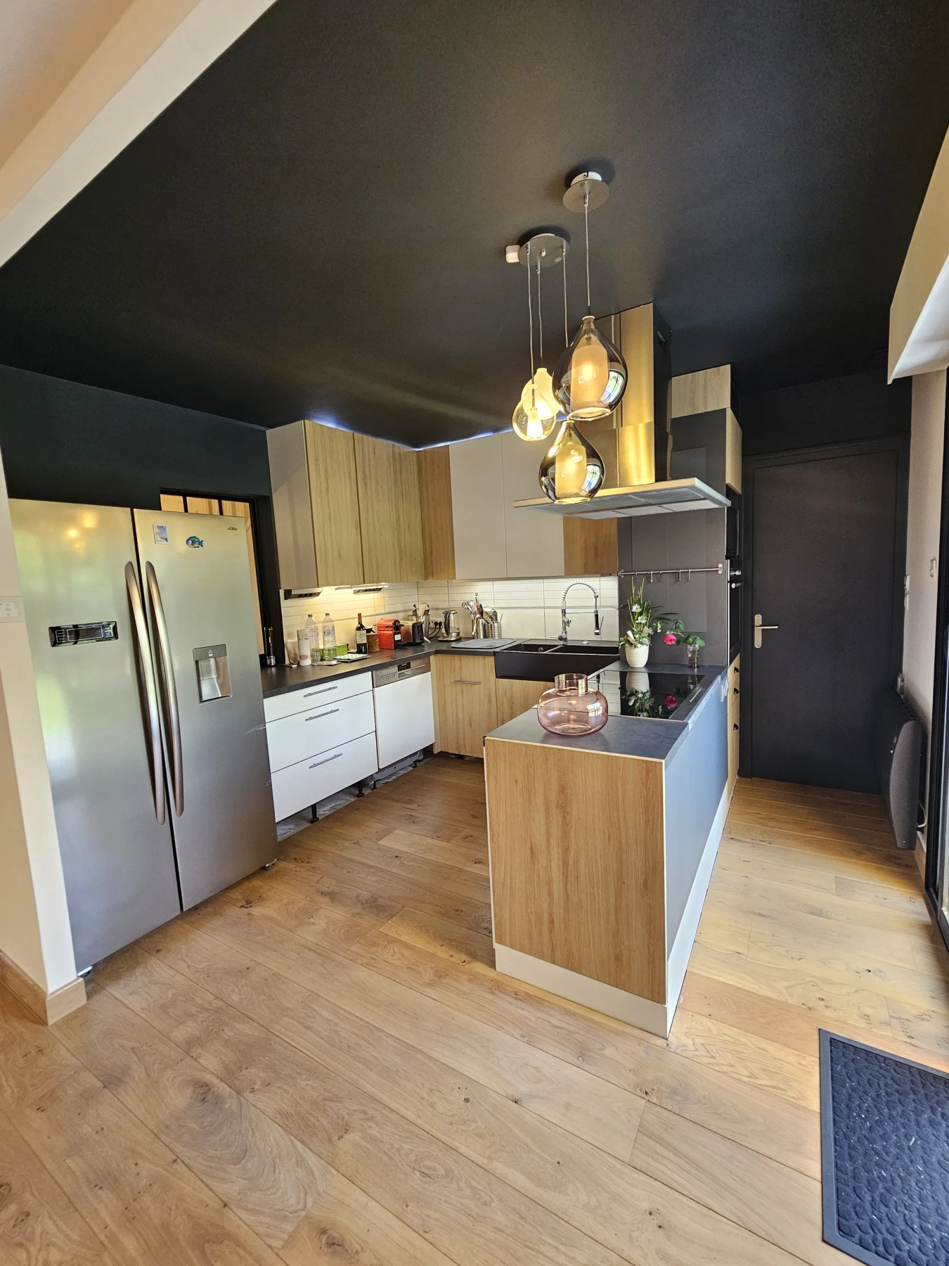 Dans la cuisine, un bleu profond a été appliqué sur le plafond et le mur principal pour structurer l’espace et apporter une touche de caractère. Ce contraste élégant met en relief les meubles bois clair et la luminosité naturelle, tout en créant un effet de cocon visuel.