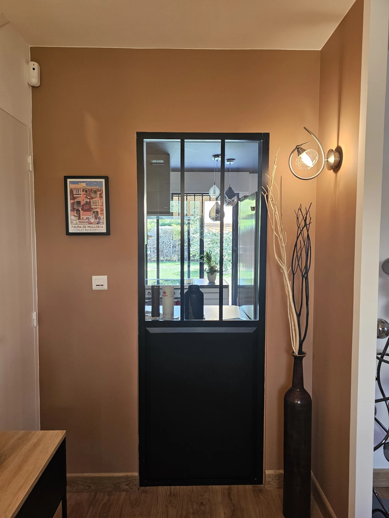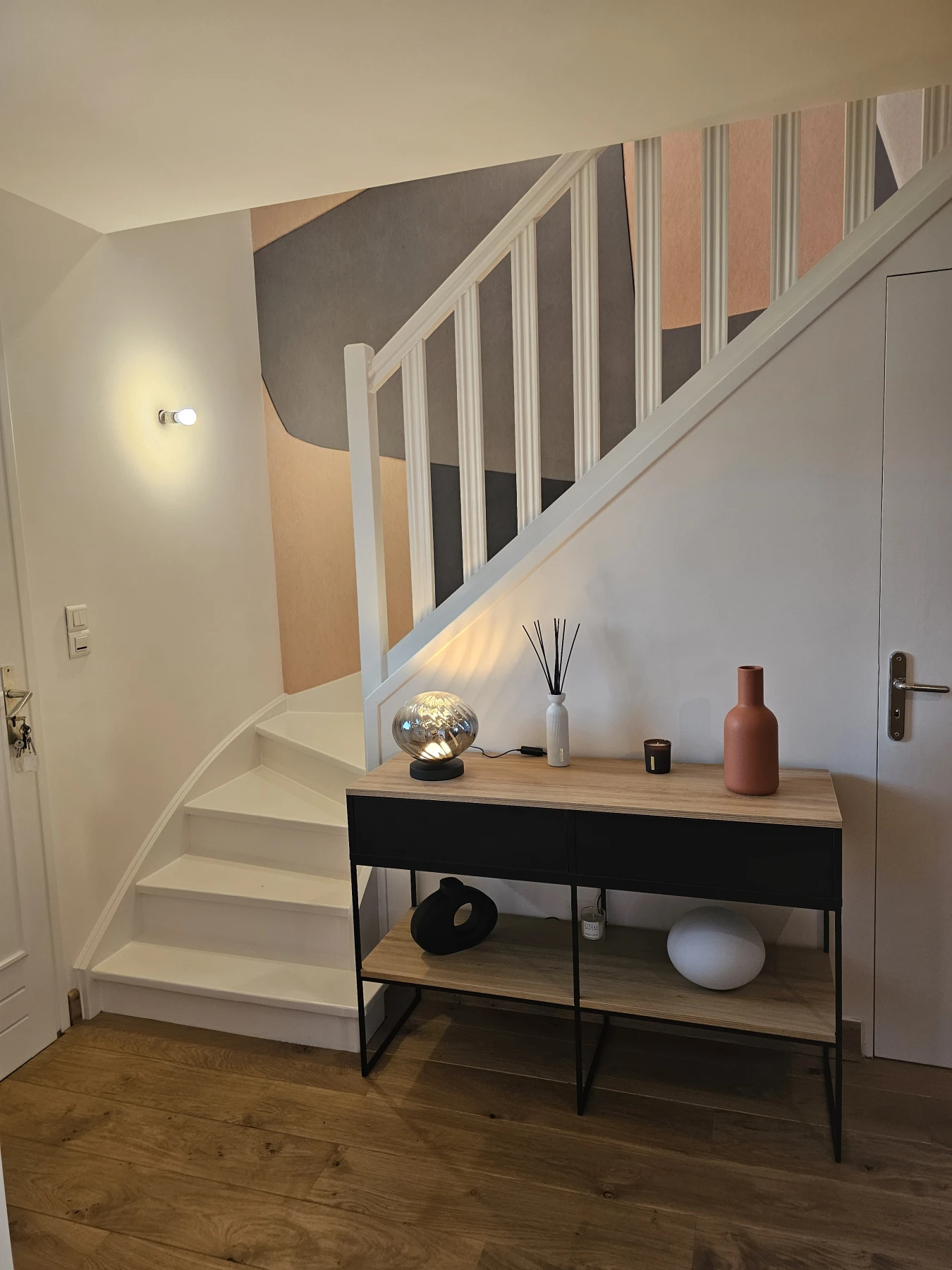 Enfin, dans l’entrée, l’atmosphère se prolonge grâce à la pose d’un panoramique mural, soigneusement choisi pour son graphisme et ses nuances subtiles. Il habille l’espace avec élégance et relie visuellement le rez-de-chaussée à l’étage.