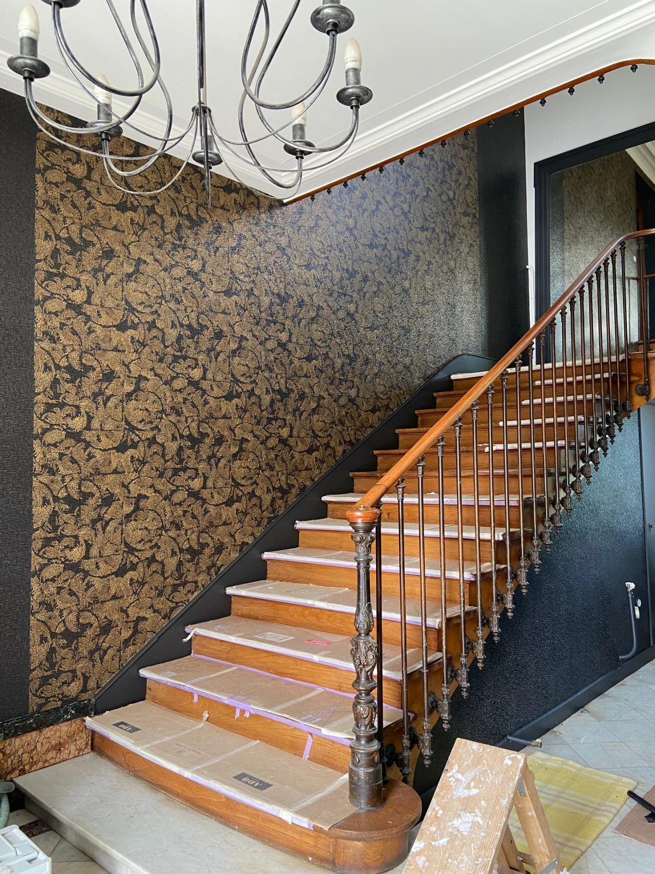 Dès le premier rendez-vous, notre équipe a proposé une palette cohérente : peinture noire mate pour encadrer l’escalier et sublimer le garde-corps en bois, papier peint texturé aux reflets dorés sur les murs latéraux pour créer une atmosphère chaleureuse et élégante, et harmonisation des éléments de menuiserie avec une finition sobre et raffinée. Le résultat est à la fois contemporain et intemporel, en parfaite adéquation avec le caractère de la maison.