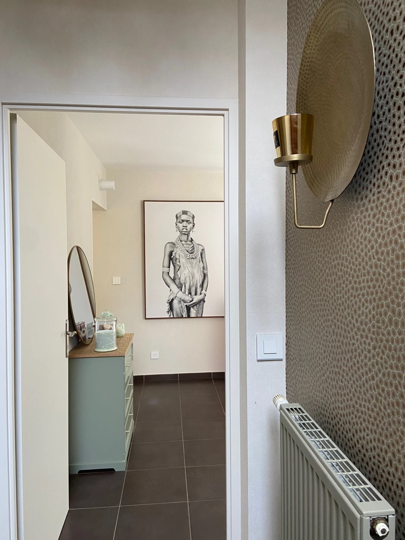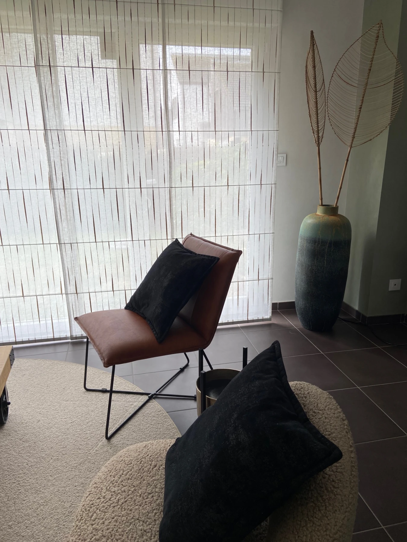 Chaque détail a été soigneusement pensé : coussins coordonnés, plaids en matières nobles, objets décoratifs tels que vases graphiques ou vide-poches feuille, sans oublier les touches murales – miroir, tableau ou photophore en laiton. L’ensemble crée une ambiance à la fois sophistiquée et accueillante, parfaitement adaptée à un quotidien confortable et esthétique.