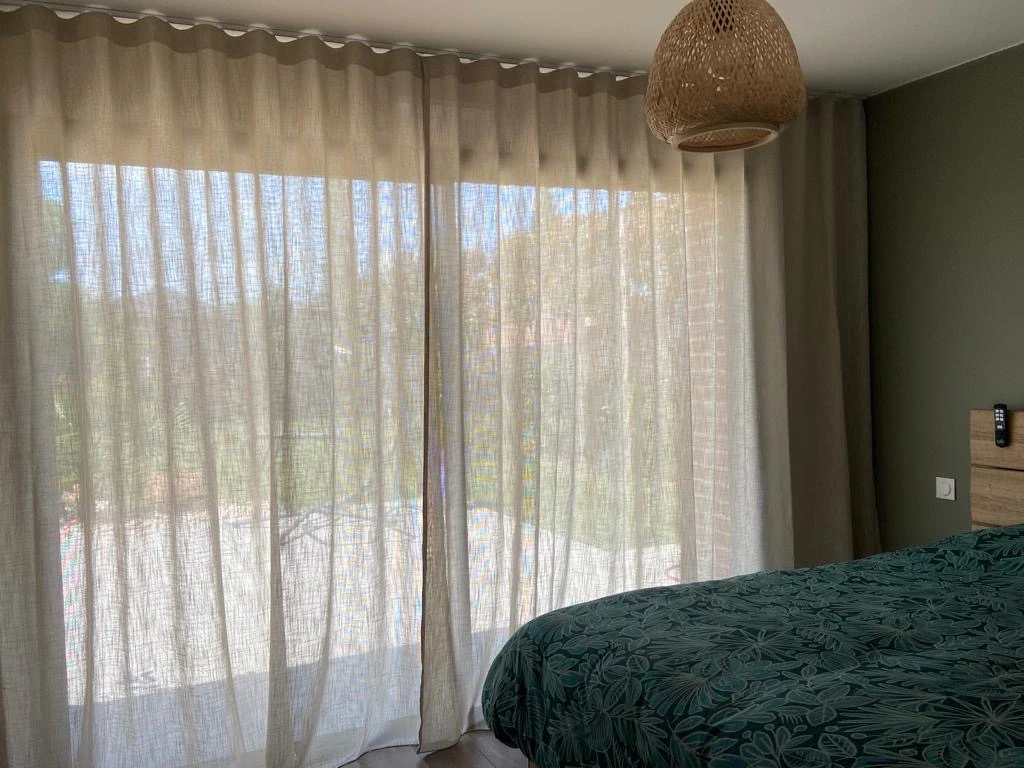 Chambre : confection sur mesure et pose rideaux en voilage Wind finition vagues sur rail.