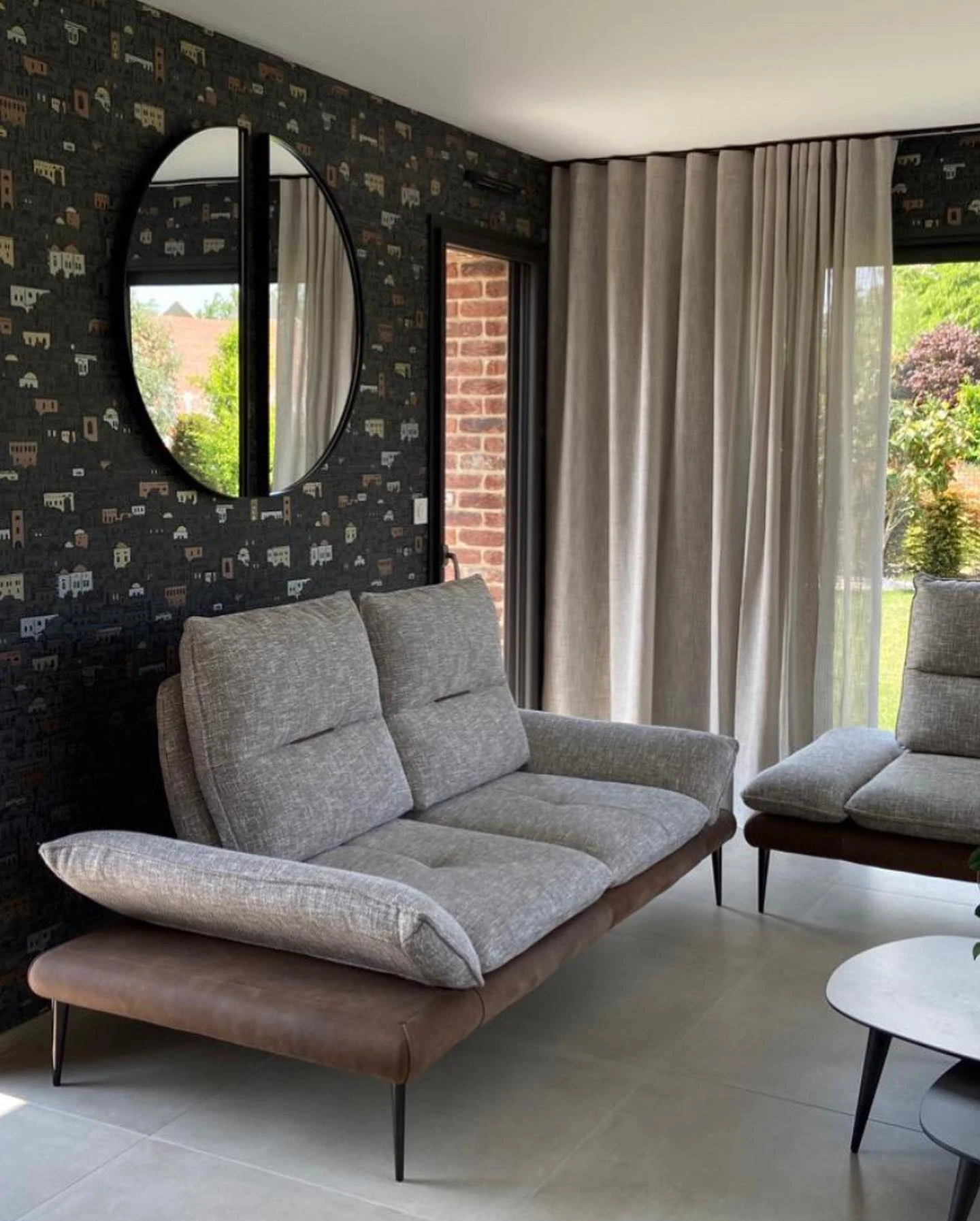 Salon : pose papier peint Cole and Son Fornasetti - confection sur mesure et pose rideaux en voilage Wind finition vagues sur rails - fournitures et pose de 2 miroirs symétriques.