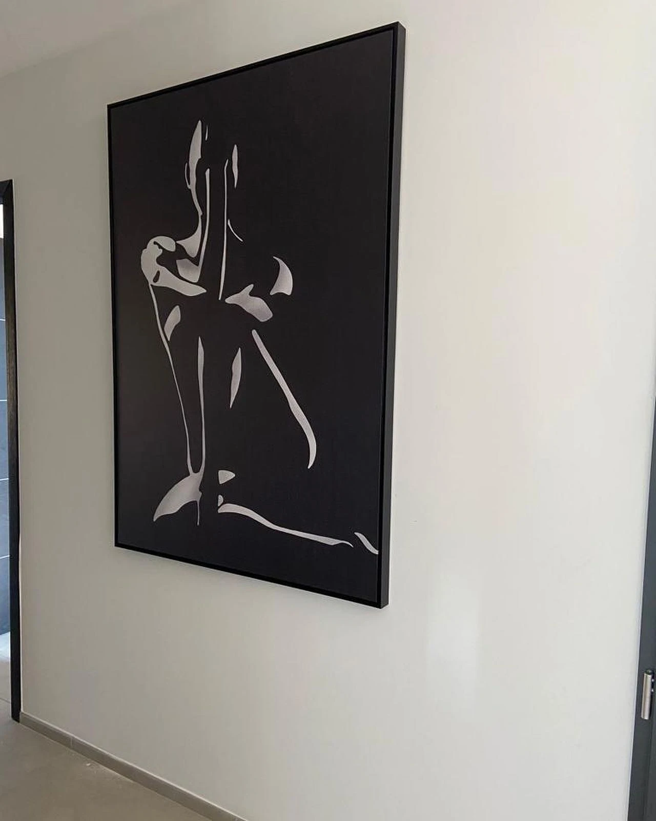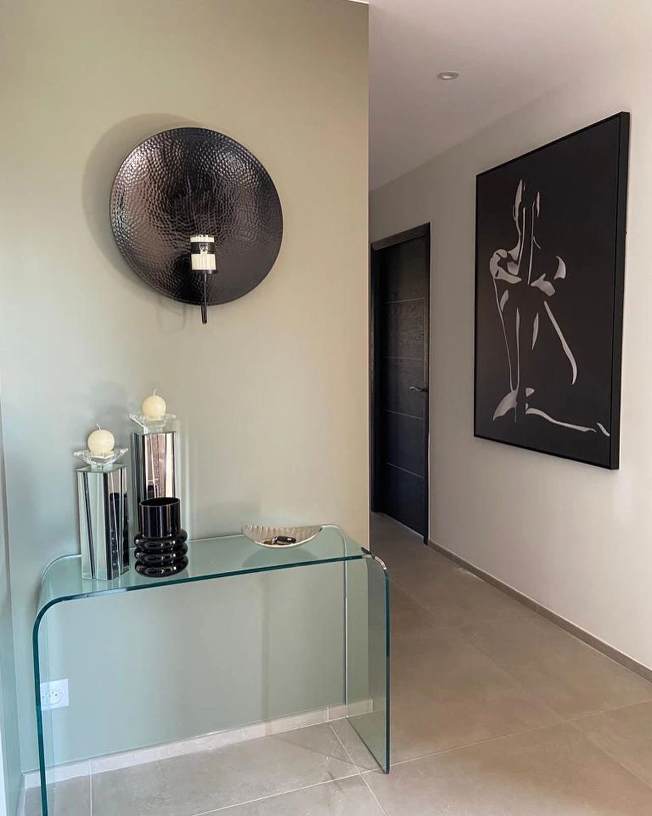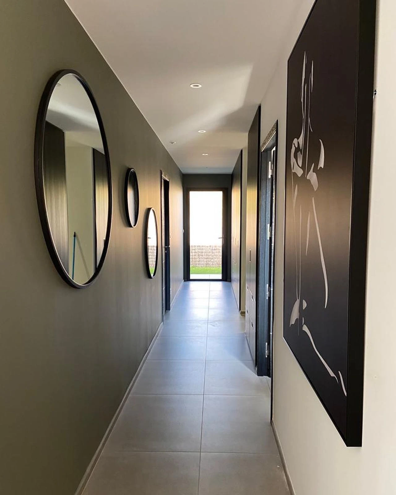 Entrée : pose peinture - fournitures et pose décorations murales : jeux de miroirs ronds, photophore et toile déco silhouette d'une femme.