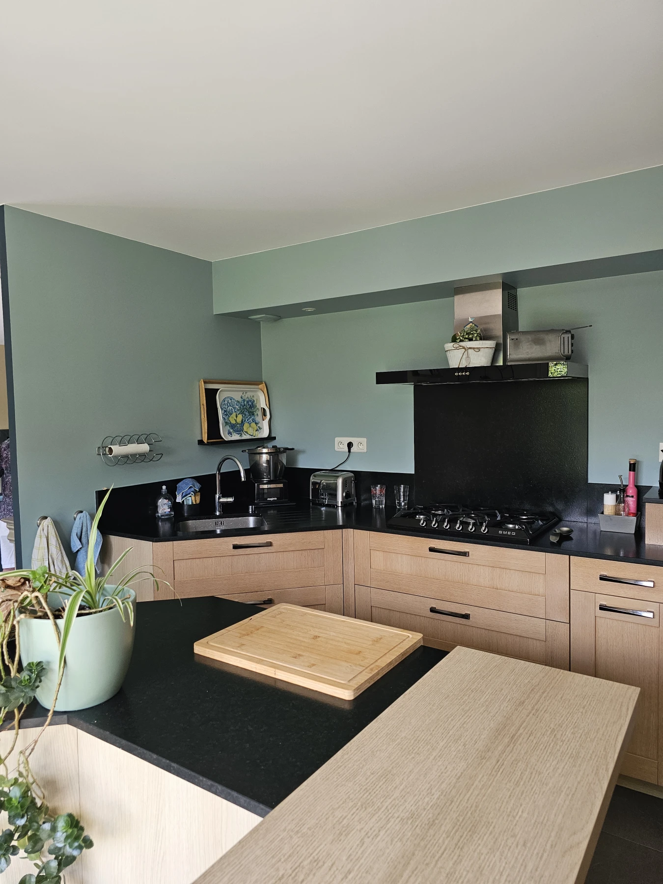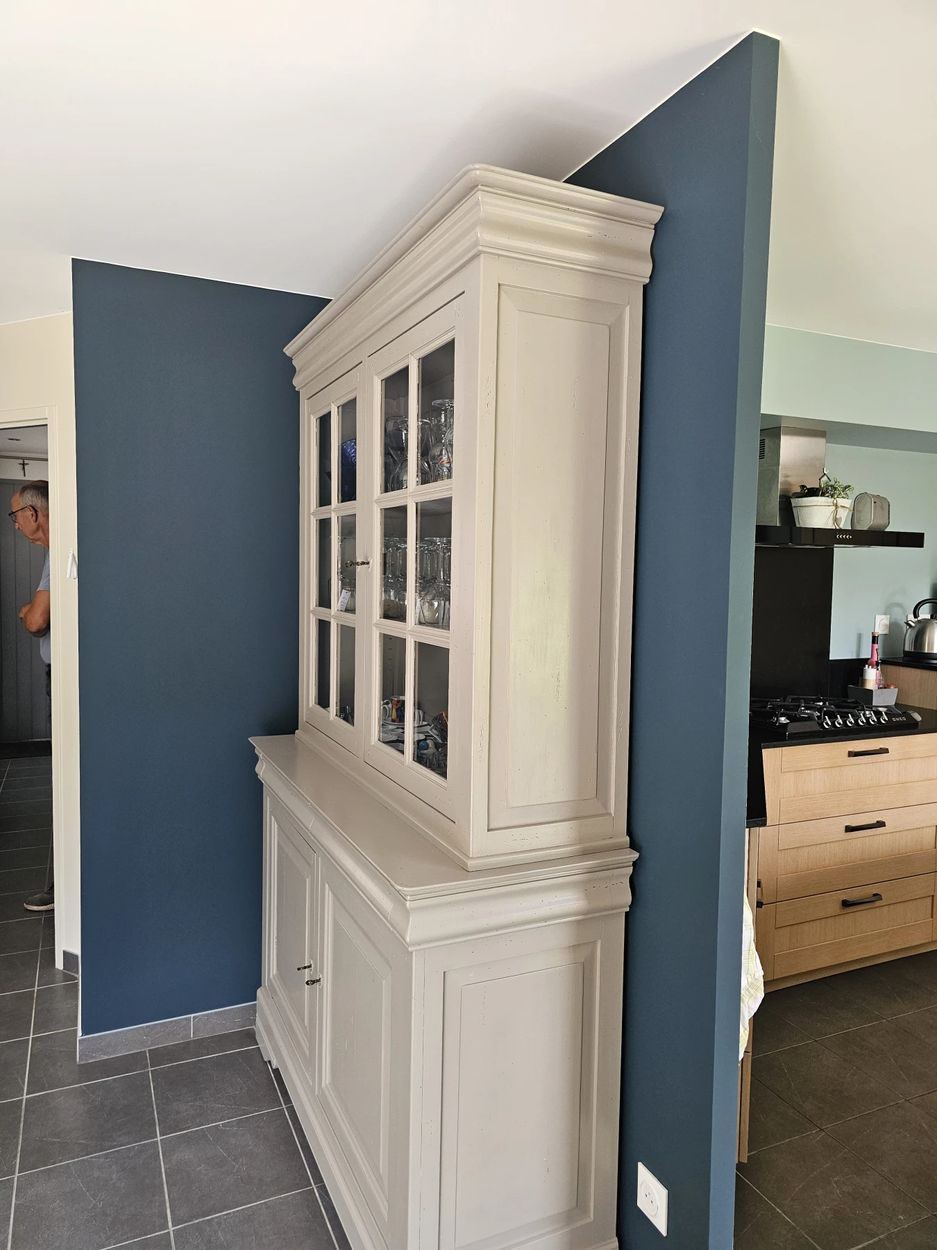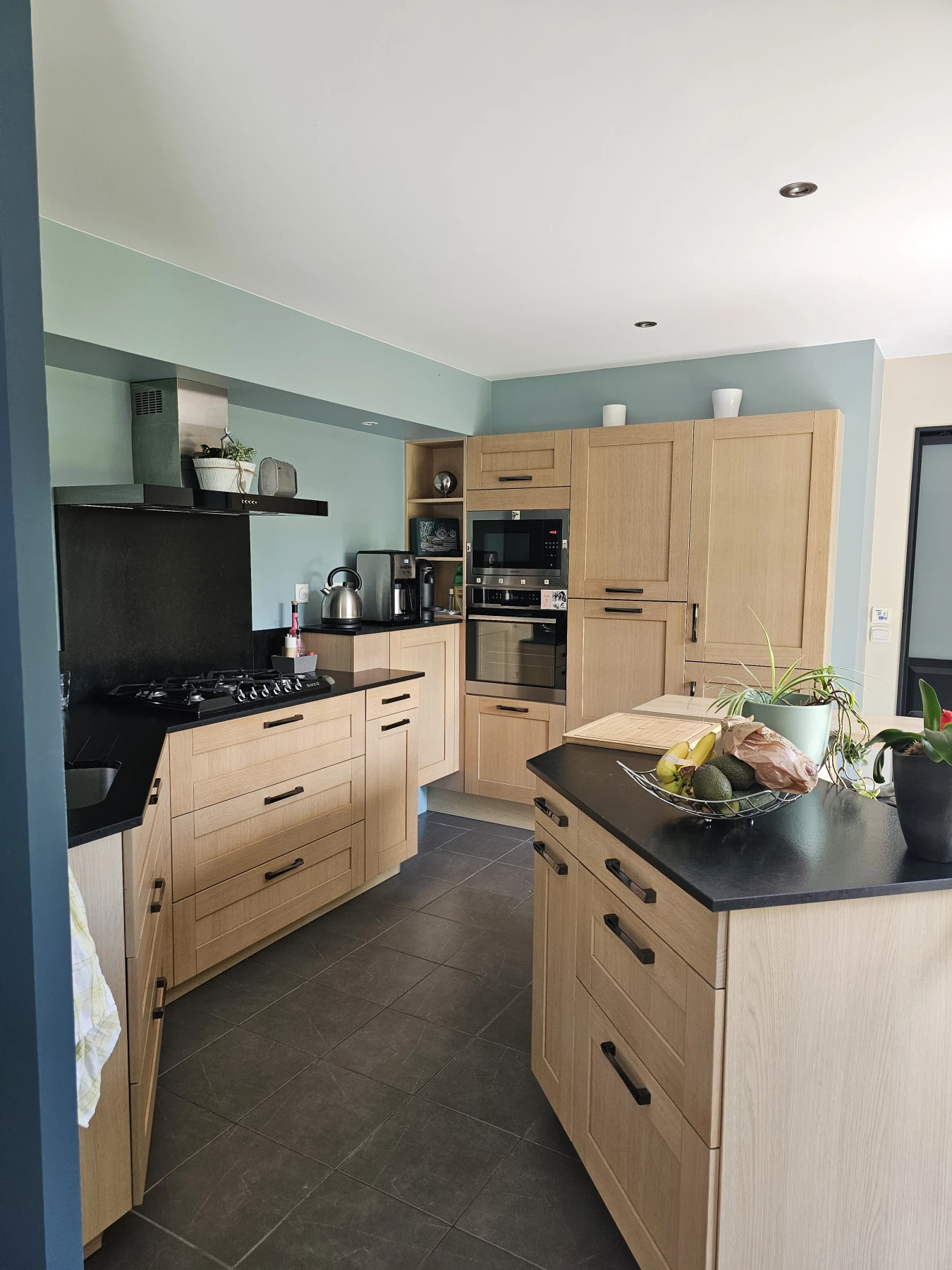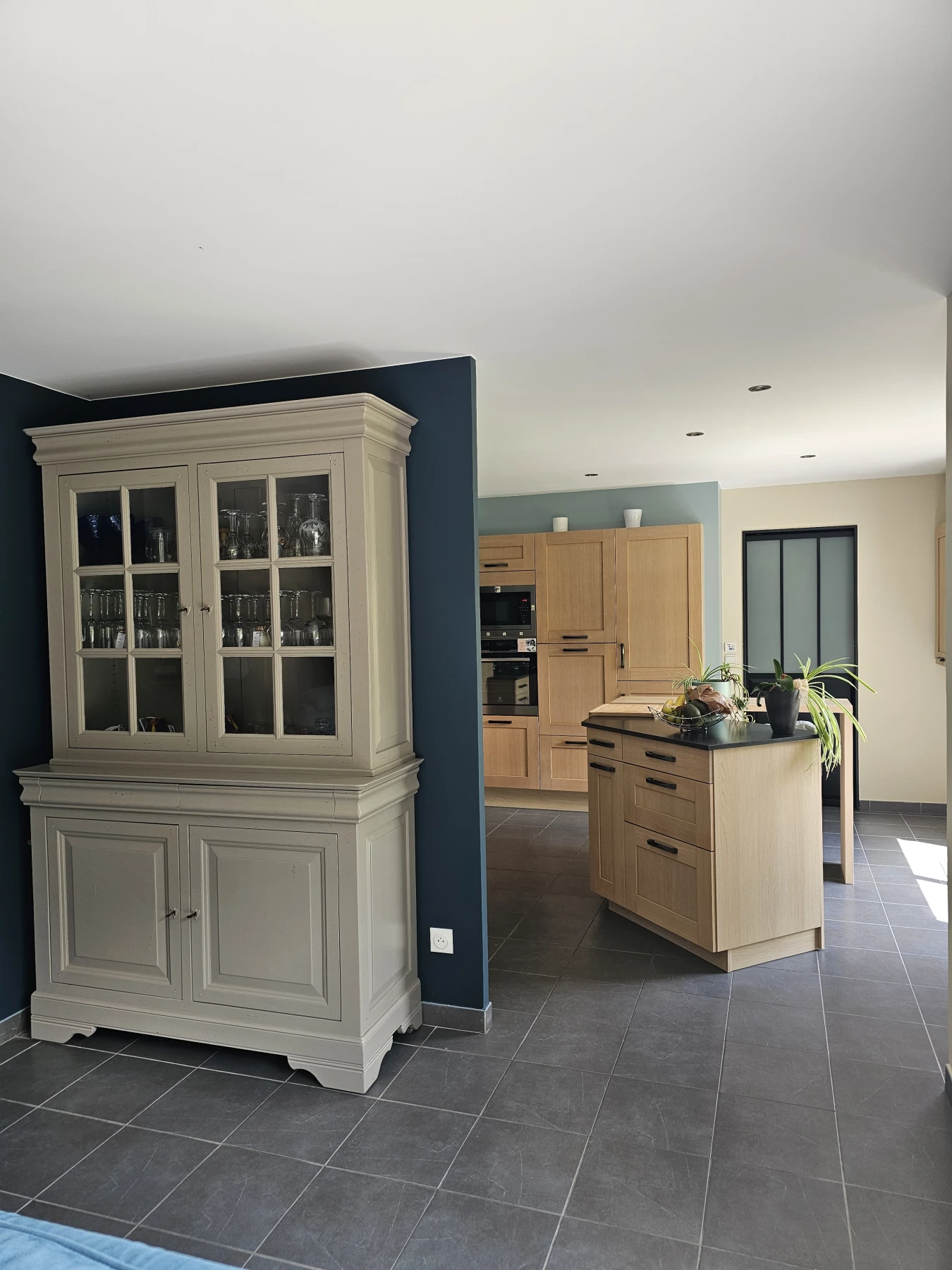 Notre travail ne s’est pas limité à la pose du papier peint. Grâce à notre sens du détail et notre approche personnalisée, nous avons conçu une déclinaison harmonieuse de teintes dans tout l’espace de vie, avec notamment un fil conducteur visuel menant à la cuisine. Chaque couleur a été choisie pour renforcer l’unité de la décoration tout en respectant les goûts et les attentes des propriétaires.