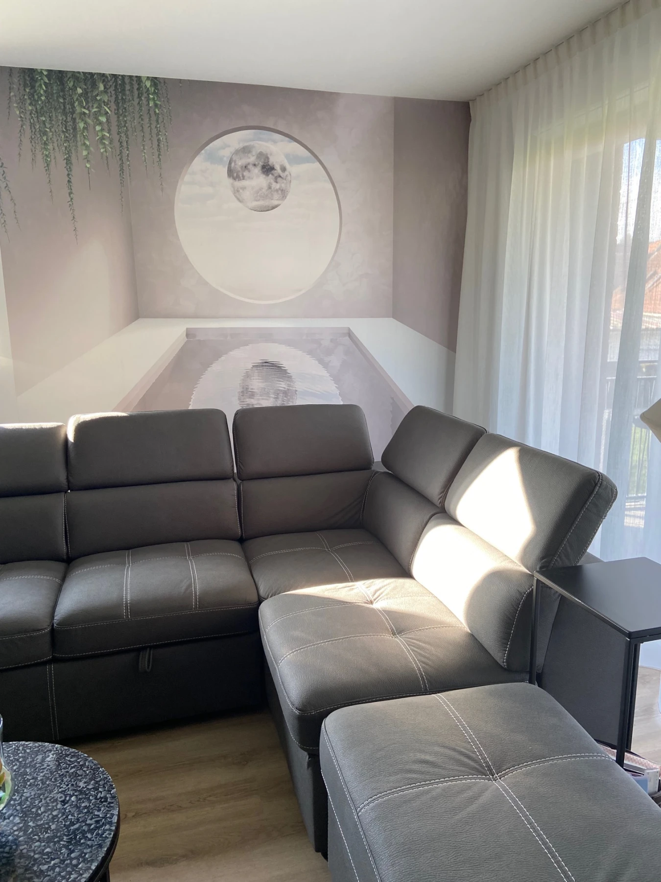Dans le coin salon, la pose d’un papier peint panoramique aux motifs minéraux et oniriques crée une atmosphère immersive et apaisante. Le choix de cette fresque murale reflète notre savoir-faire en décoration sur mesure et notre capacité à proposer des ambiances personnalisées en cohérence avec les goûts du client.