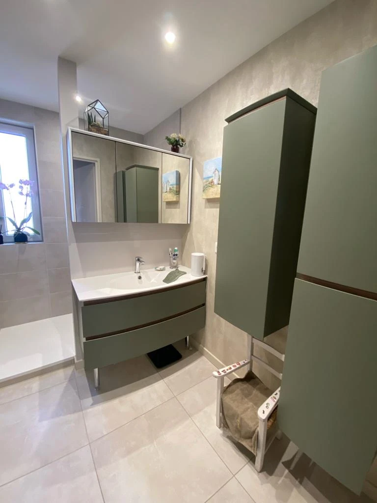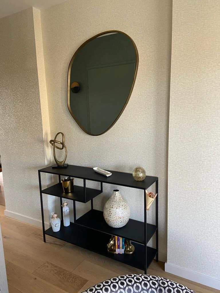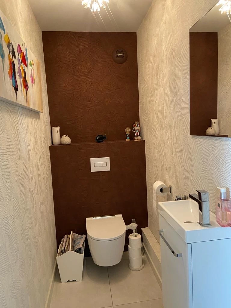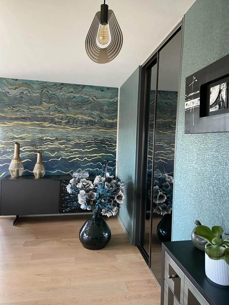 La décoration murale est complétée par un panoramique Casamance Azurite, véritable œuvre d’art murale, qui attire le regard dès l’entrée. Pour une harmonie parfaite, LES DECORS CONSEILS a également conseillé et fourni le miroir, le vase décoratif et la statue, des pièces soigneusement sélectionnées pour enrichir l’ambiance générale.