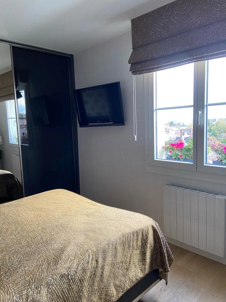 Enfin, tout l’appartement a été équipé de stores bateaux confectionnés sur mesure, ainsi que d’un couvre-lit assorti dans des tissus Casamance, pour une finition textile haut de gamme, parfaitement coordonnée.